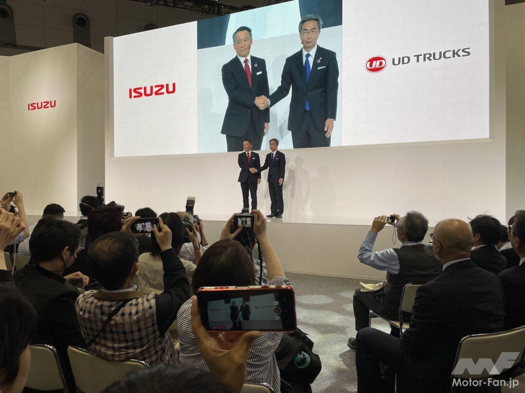 いすゞとUDトラックス。両者の関係は「後者が前者グループに入った」というもので、そこからはどうしても「どうもうまくいかない」「仲が悪い」「互いが元の企業風土を主張し合う」というような印象がどうしてもつきまとう。しかしいすゞ×UDトラックスのブースで開催されたプレスカンファレンスでは、いすゞ・南社長とUDトラックス・丸山社長がともに登壇、「今の時代、一企業の枠組みを超え、力を合わせていくことが不可欠です。ですから、私達は互いの技術ノウハウを生かし、非常にうまくやっていますよね」「はい。ビジネスの面だけでなく、人的交流や文化的交流も盛んに行い、ともに新たな価値を創造しようとする風土が醸成され続けています」と、目指す目的に向かって両社がともに邁進している様子がうかがえた。