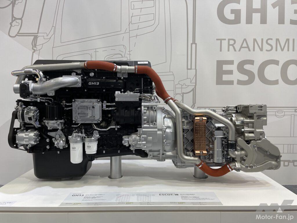 電動車はバスにも展開。路線バスをBEV化したエルガEVがワールドプレミアである。見どころはなんといっても完全にフルフラットとなったキャビン。いわゆるR-RWDである路線バスではパワートレーン+ドライブトレーンを収めるためにどうしても後軸まわりに段差が生じてしまうが、左右それぞれにeアクスルを置く方法でフルフラットを実現した。