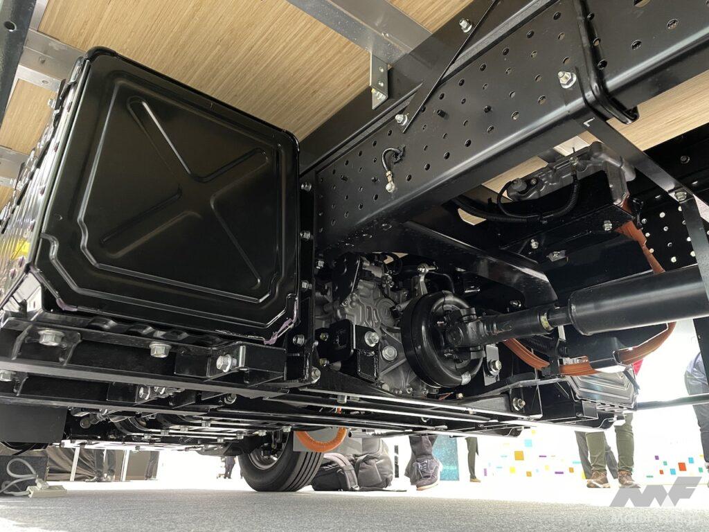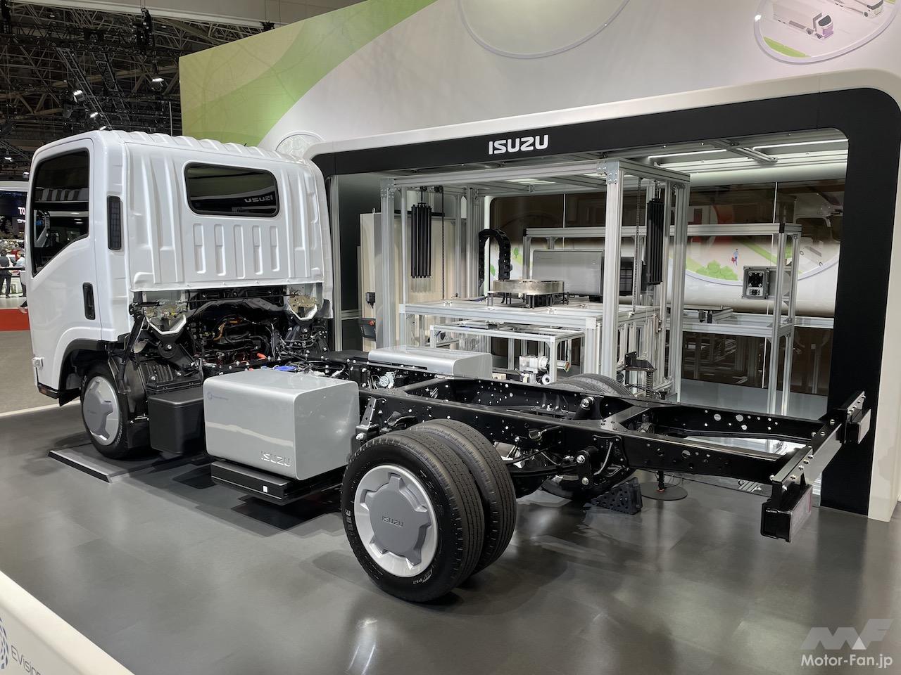 EVision Cycle Conceptとともにブースの花形だったのが、先日登場したばかりのトラック型BEV・エルフEVである。エンジン車とプラットフォームを共通化することで架装部に制限のない設計とした。トラックの世界では「シャシーから上はお客さまのスペース」という絶対的な約束事があり、フル電動化にあたってもそこが守られた格好だ。