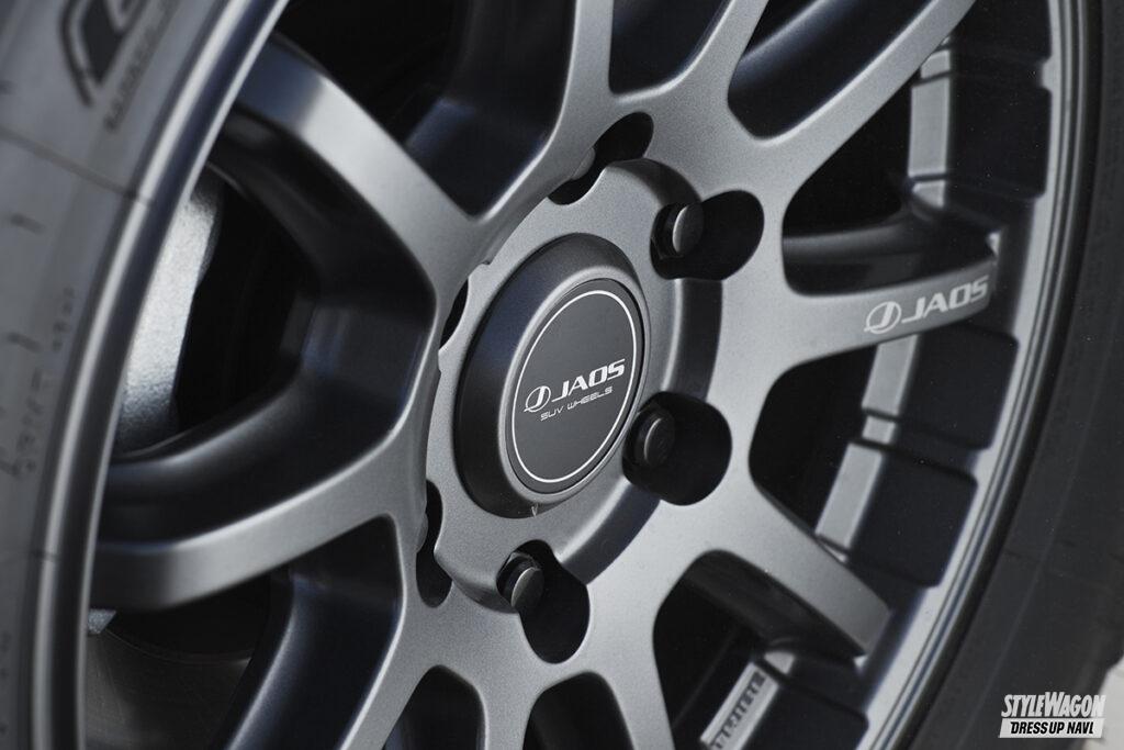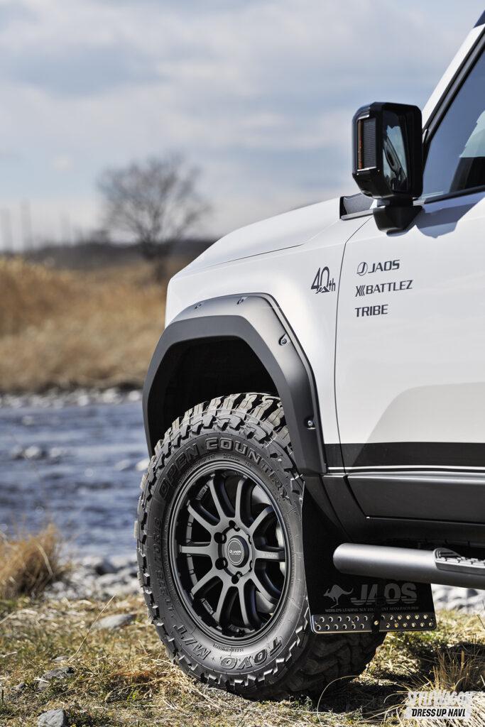優れた四駆性能を持つランドクルーザー250。ホイールをカスタマイズするならクルマの持ち味に相応しい重厚で力強いデザインに加え、ヘビーな車両重量に耐えうる高い強度も備えたモデルが相応しい。老舗四駆パーツメーカーのジャオスがランクル250ユーザーに勧めたいホイールは、センター部からラウンドしながら伸び行く10本スポークデザインを採用したトライブクロスである。