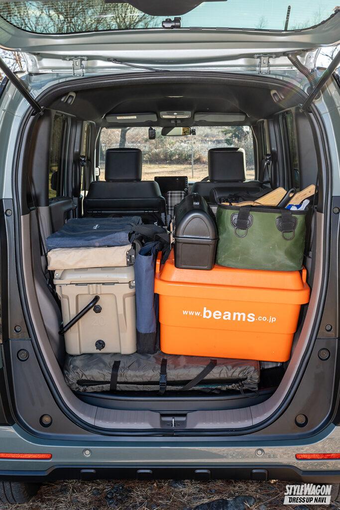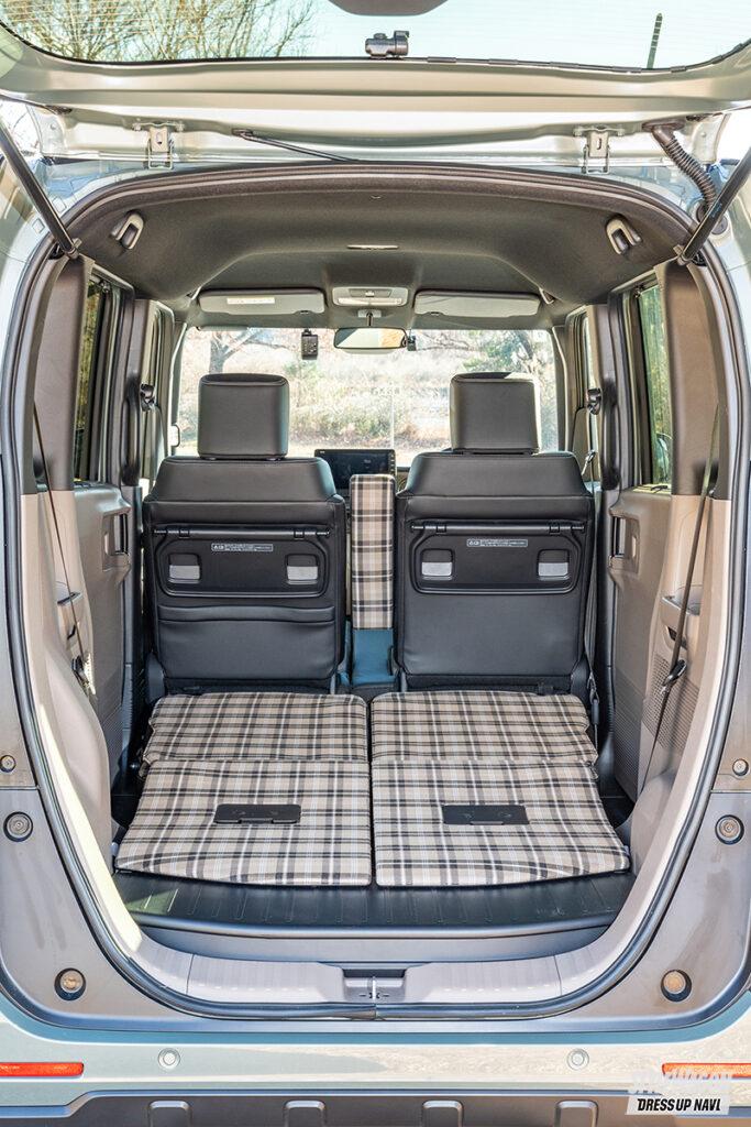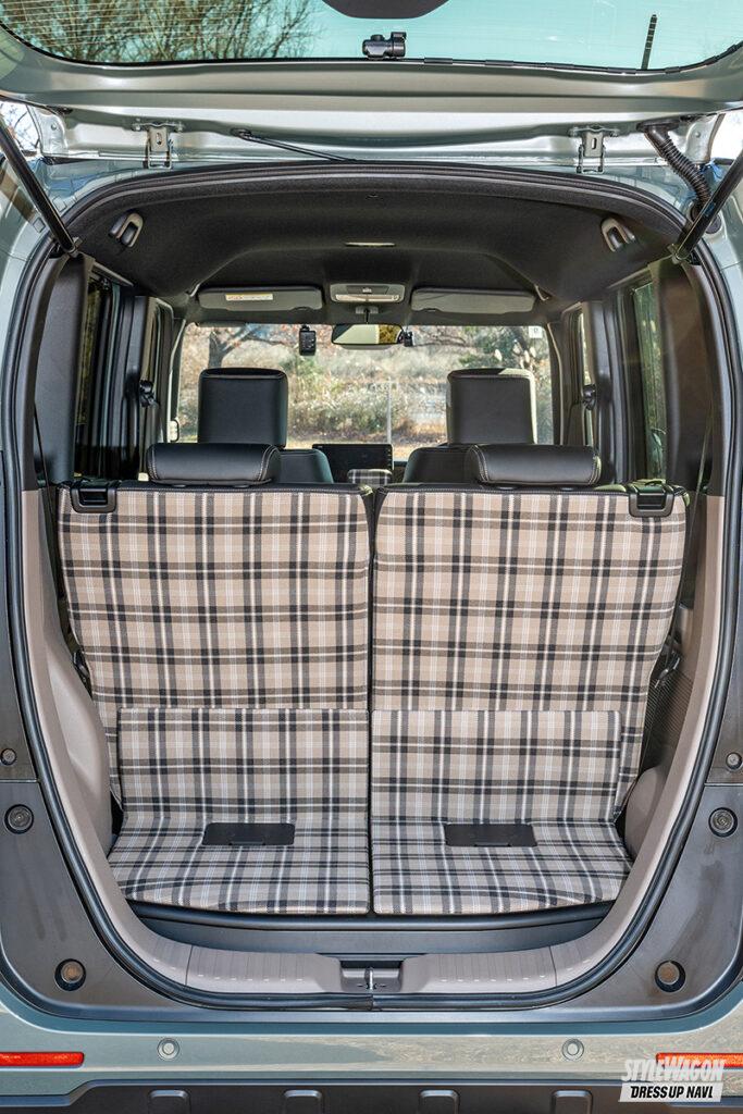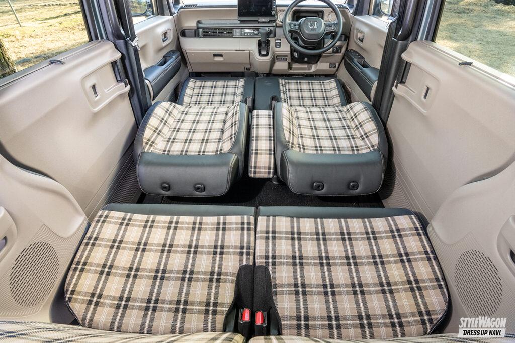 N-BOXの第三形態としてデビューしたJOYは、先行して発売されたライバルたちとは趣が少々異なる。ギア感を強く押し出す後者に対し、JOYのテーマはおしゃれなピクニック用品を思わせるデザイン。その真骨頂がインテリアで、タータンチェック柄の撥水シートを中心に、全体をブラウンでまとめた空間はまるでおしゃれなリビングにいるような感覚。さらに後席を前に倒すだけで広くフラットな空間を作り出す「ふらッとテラス」は、ちょっとした休憩などでリラックスできるスペースとしてうれしい装備だ。ただちょっと残念なのが、後席を倒した時の荷室長が約1480mmということ。そもそも就寝スペースではなく足を伸ばして座ることが目的なので、大人が寝転ぶということを前提とはしていない。もう少し荷室長を広げて欲しかったと思う人も少なくないはずだ。