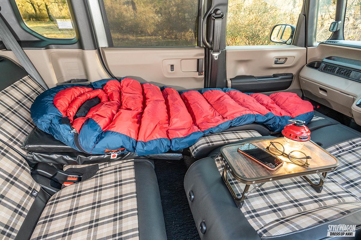 そんなJOYでの車中泊は、ヘッドレストを外した前席を倒し後席の座面も使って就寝スペースを作るパターン。身長170cm前後の大人であればジャストサイズの就寝スペースを作ることができ、寝転んでみると若干の凸凹はあるものの、ほとんど気にならないレベル。ただし頭を後席側にして寝転ぶと、少々背中が反ってしまうためキャンプマットで高さを微調整した。見た目はやや窮屈そうに見えるが、寝返りも十分できるし一晩寝て身体のどこかが痛いということも全くなかった。車中泊ではなくデイキャンプのリラックス空間として便利に使えそうな「ふらッとテラス」も含め、JOYのアウトドア力は抜群でした。