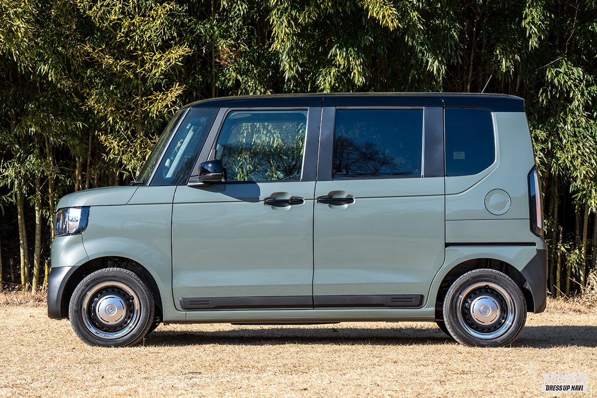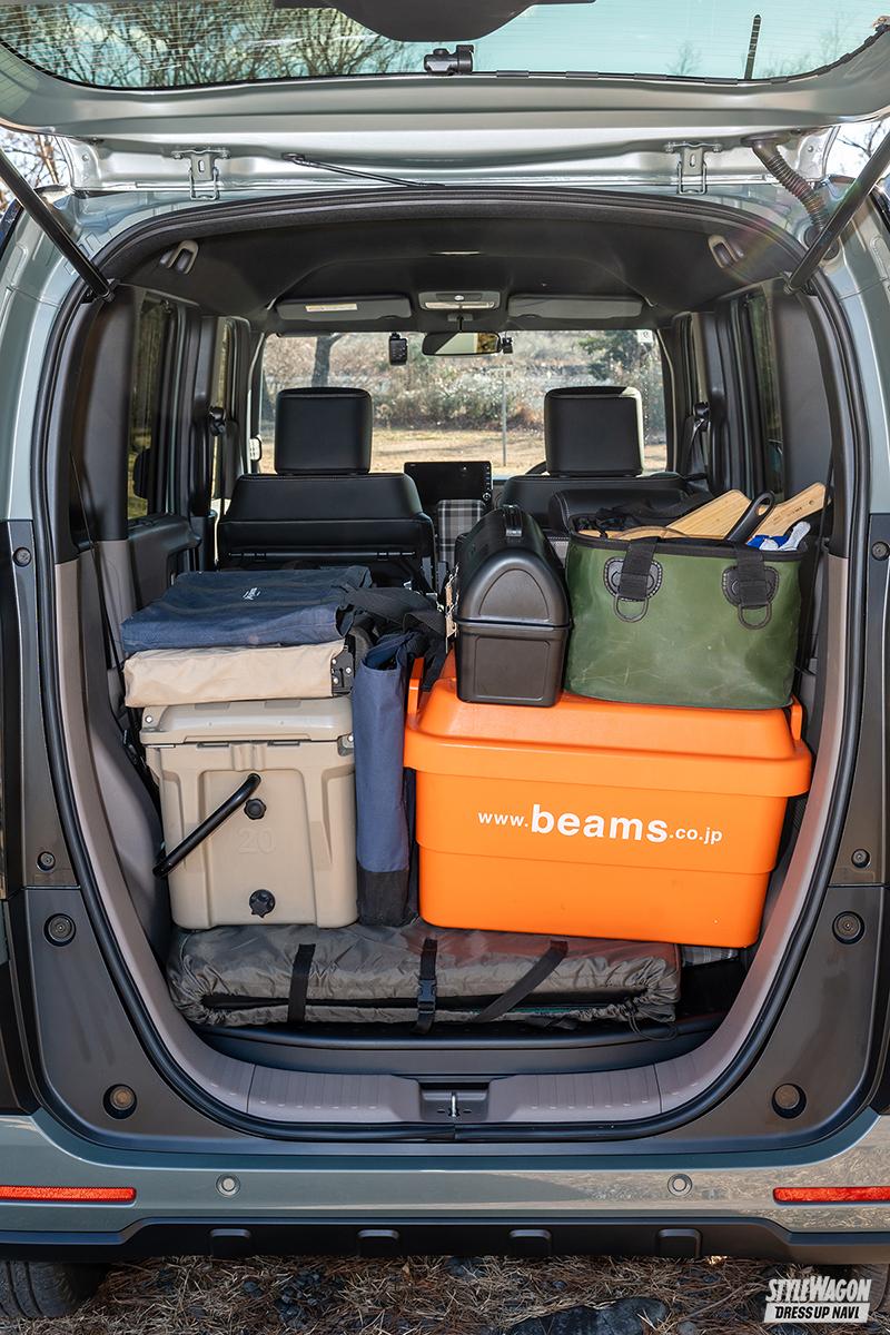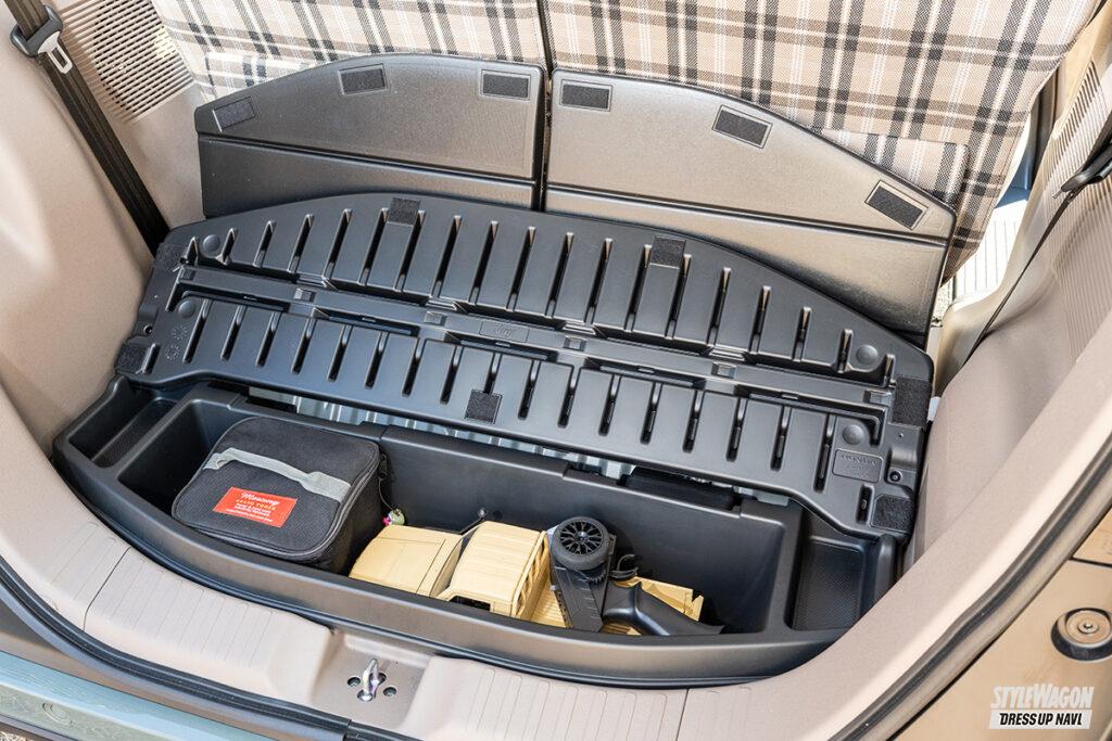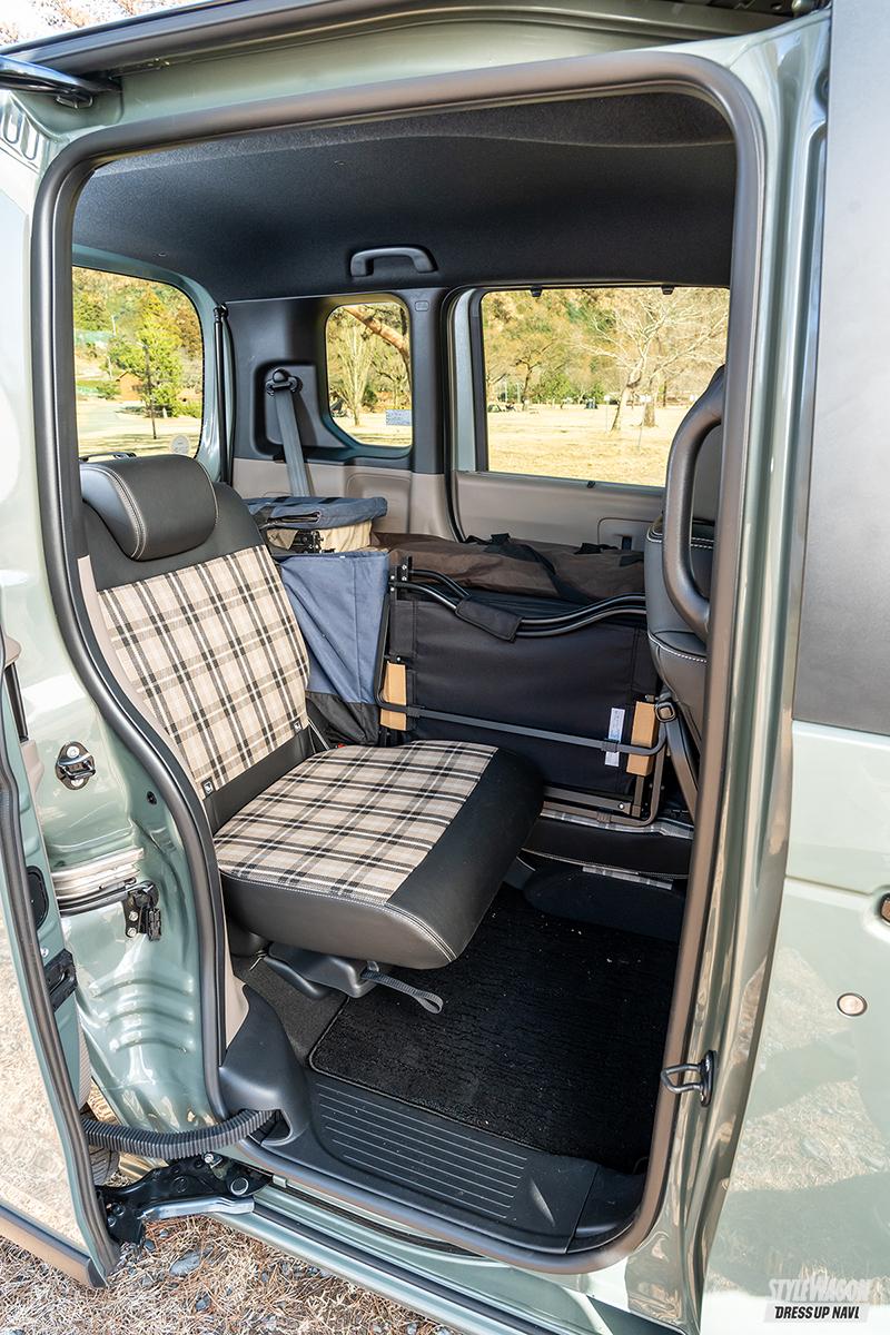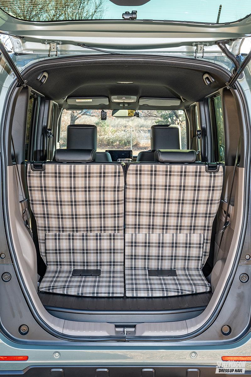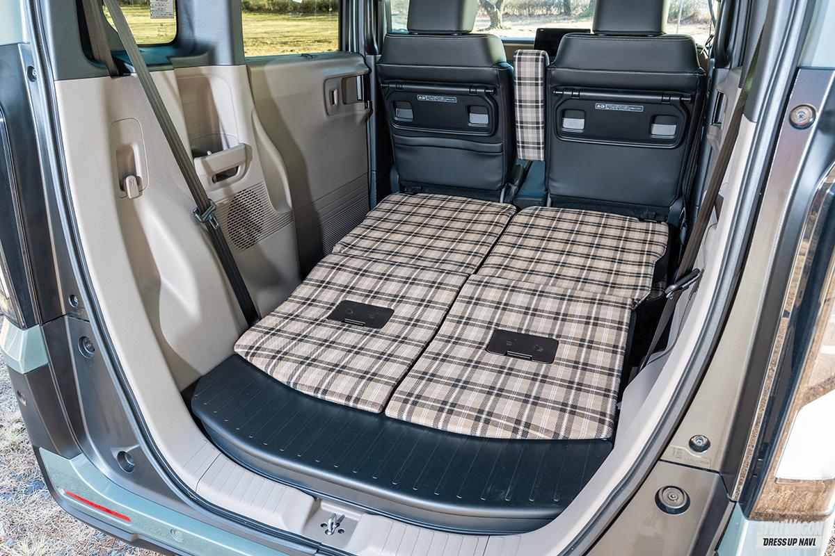 N-BOXの第三形態としてデビューしたJOYは、先行して発売されたライバルたちとは趣が少々異なる。ギア感を強く押し出す後者に対し、JOYのテーマはおしゃれなピクニック用品を思わせるデザイン。その真骨頂がインテリアで、タータンチェック柄の撥水シートを中心に、全体をブラウンでまとめた空間はまるでおしゃれなリビングにいるような感覚。さらに後席を前に倒すだけで広くフラットな空間を作り出す「ふらッとテラス」は、ちょっとした休憩などでリラックスできるスペースとしてうれしい装備だ。ただちょっと残念なのが、後席を倒した時の荷室長が約1480mmということ。そもそも就寝スペースではなく足を伸ばして座ることが目的なので、大人が寝転ぶということを前提とはしていない。もう少し荷室長を広げて欲しかったと思う人も少なくないはずだ。