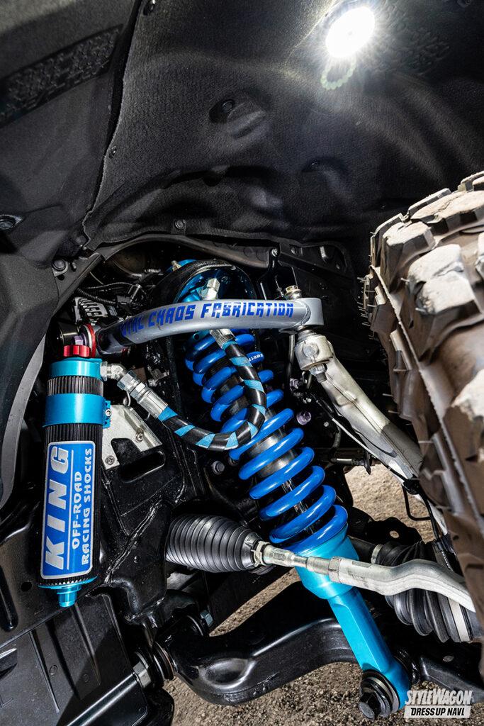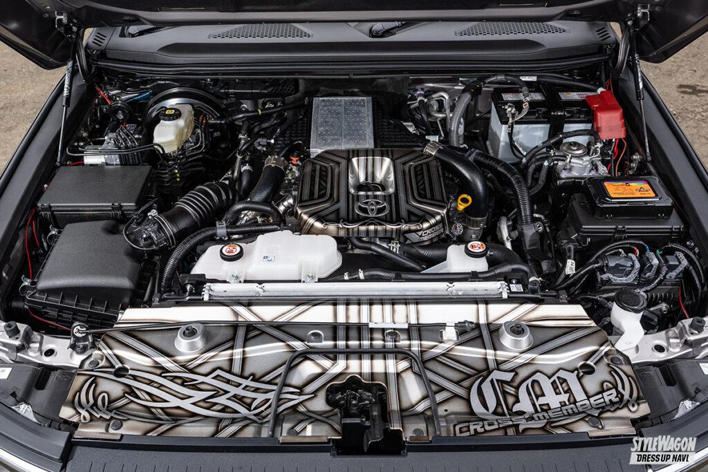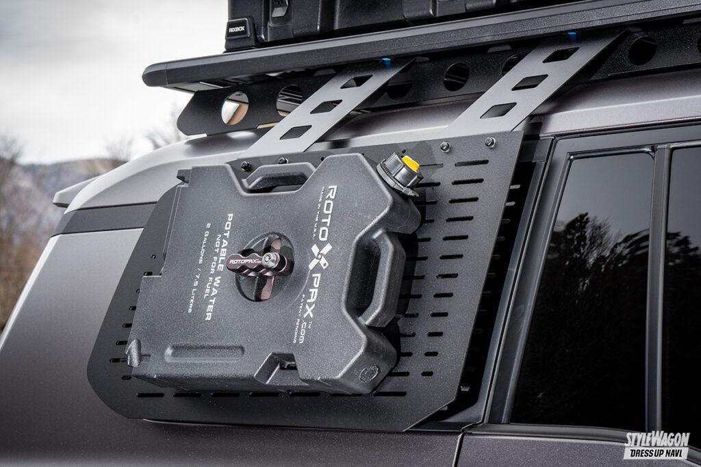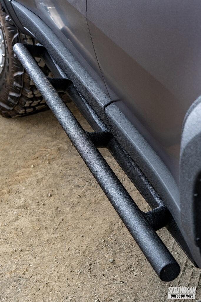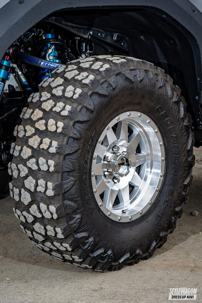 先だって開催されていた東京オートサロンの会場においても国内外問わず、非常に多くのギャラリーから注目を浴びていたのが当車両。オーバーランダーよろしくルーフにアウトドア系ギアを満載し、トータル4インチものリフトアップを施したボディには巨大マッドテレーンタイヤを履かせて魅せる1台へと昇華させている。