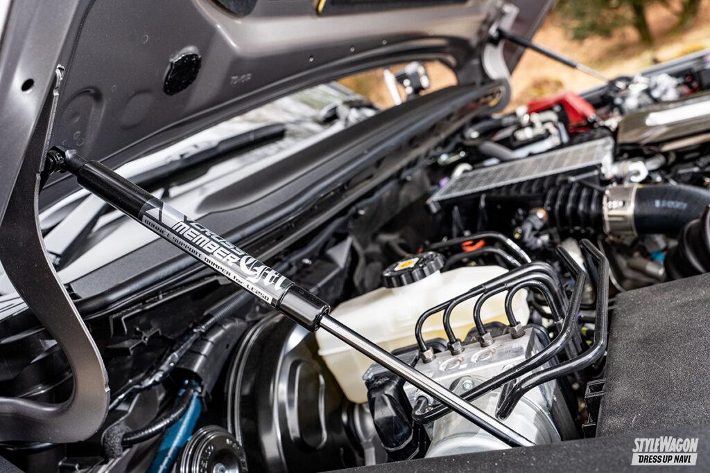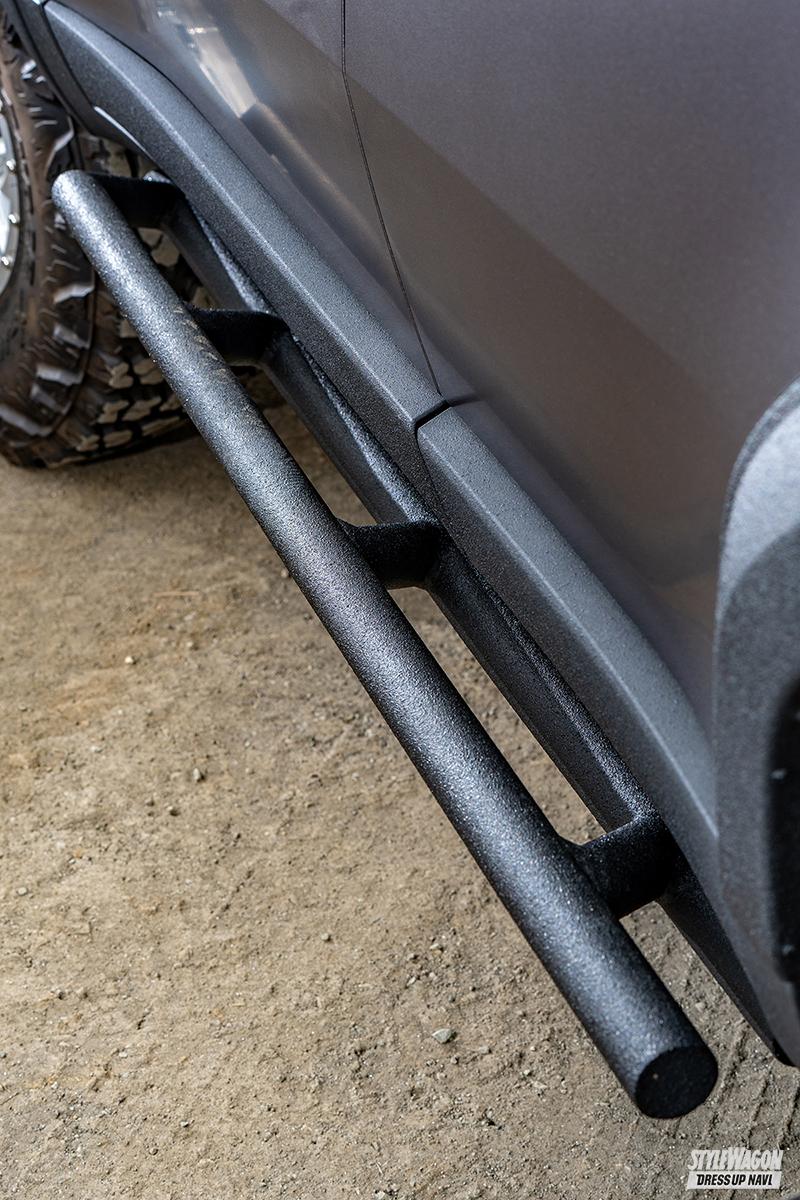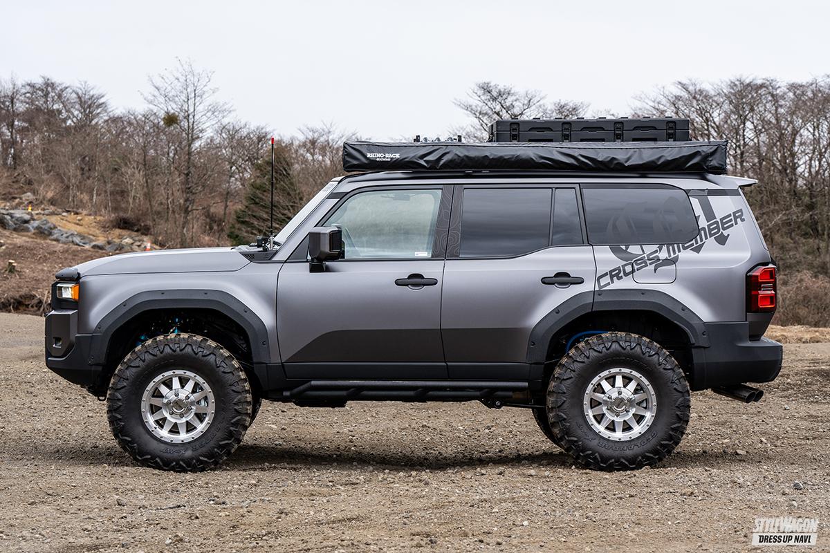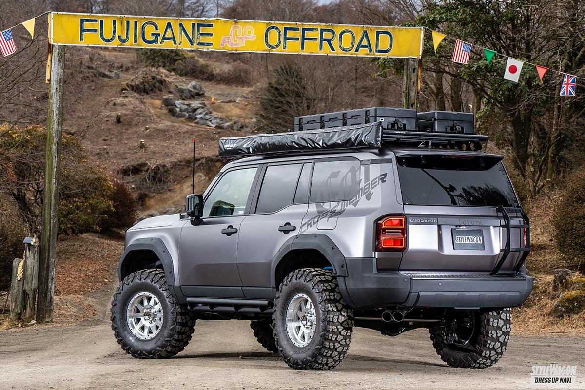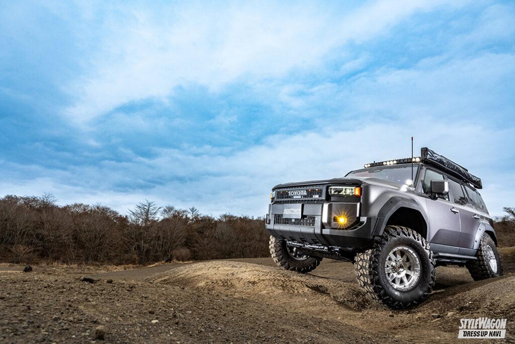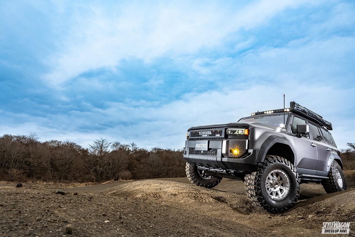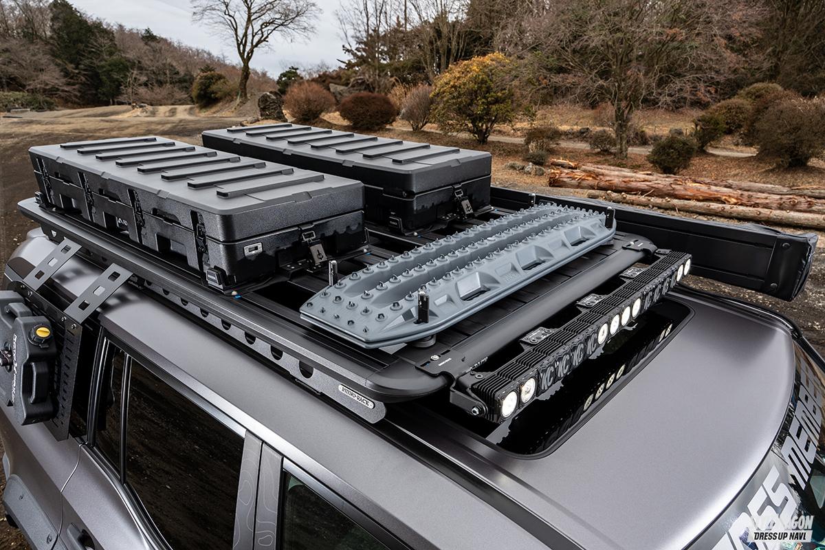 先だって開催されていた東京オートサロンの会場においても国内外問わず、非常に多くのギャラリーから注目を浴びていたのが当車両。オーバーランダーよろしくルーフにアウトドア系ギアを満載し、トータル4インチものリフトアップを施したボディには巨大マッドテレーンタイヤを履かせて魅せる1台へと昇華させている。