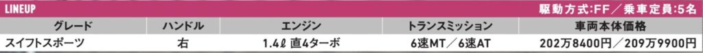 一方でエンジンは200㏄ダウンした1.4ℓターボエンジンとなり、パワーは3㎰アップながらも、トルクは70Nmも高めたところがポイント。ミッションは3ペダルが6速MTはそのままに、2ペダルはCVTから6速ATにあらためられた点は見逃せないところだ。