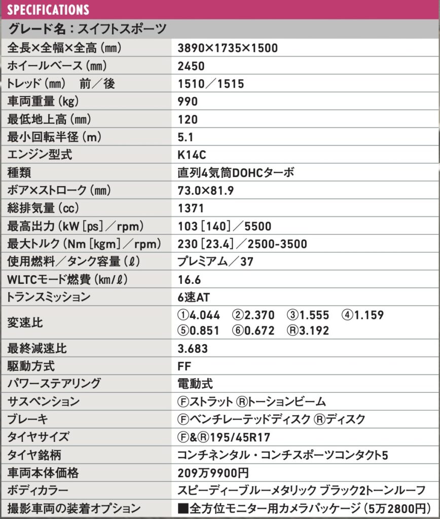 欧州におけるハイスピードも受け止めるために開発が行なわれたスイフトスポーツ。「1tを切る車体で200㎞/hオーバーの世界を達成するには、色々とやる必要があった」とは開発者の弁だ。