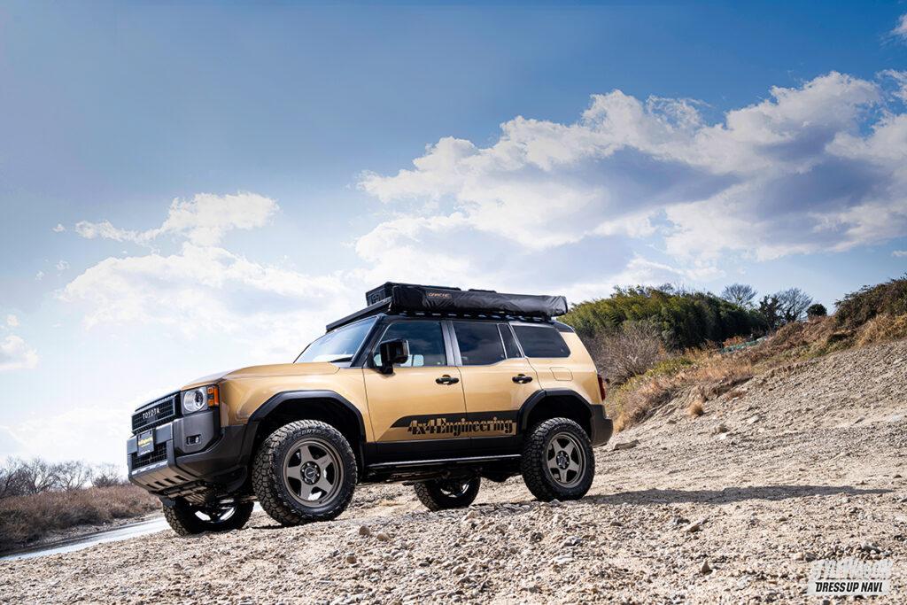 4×4エンジニアリングのランクル250はオーバーランド仕様がコンセプト。そもそも「オーバーランド」とは、オーストラリアなどの広大で自然に恵まれた国々で砂漠や森林、岩場などを走破し長距離移動を行うようなアウトドア志向のカーカルチャーを指す言葉。それが、ここ最近のSUVブームとともに、一気に盛り上がっているというわけ。そのため取り入れたのが、フロントランナーのルーフラックなどのトップ部分の架装なのだが、実は今回の目玉はそこではない。見るべきは足まわりだ。