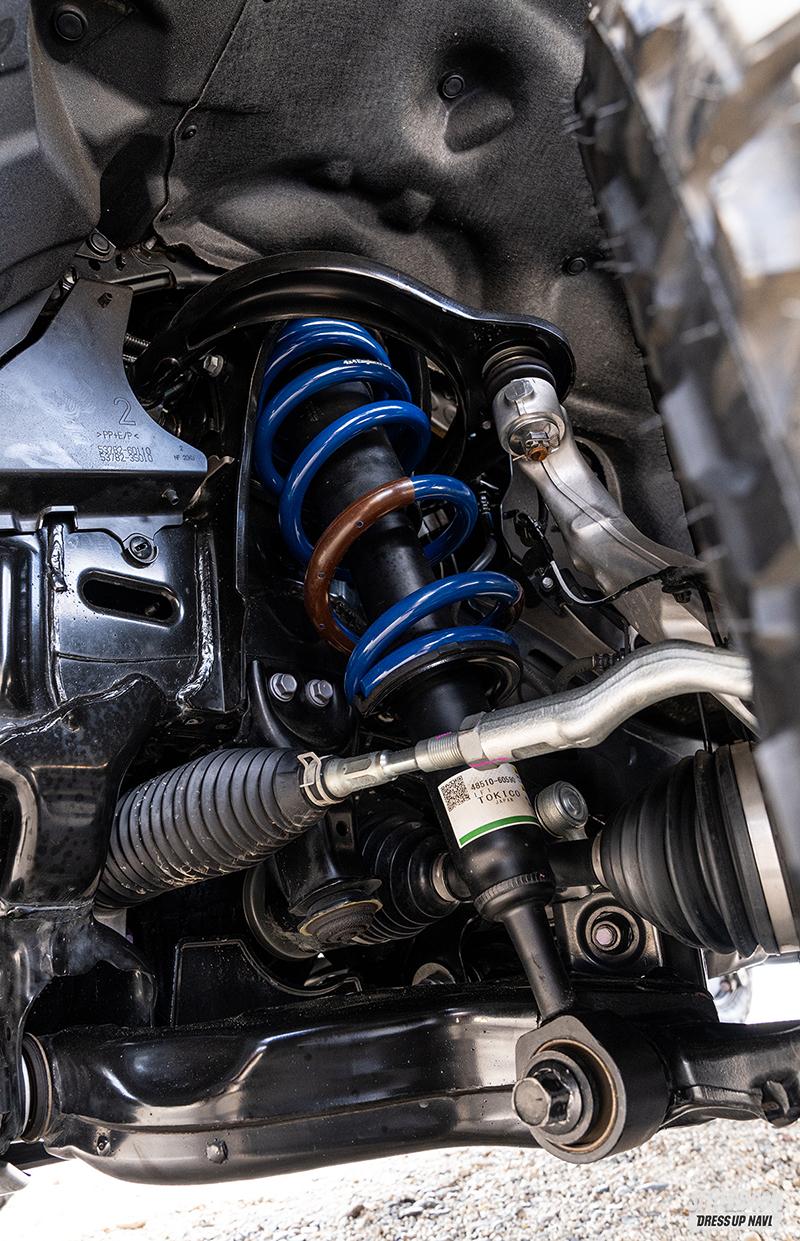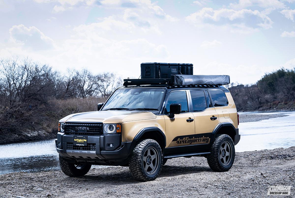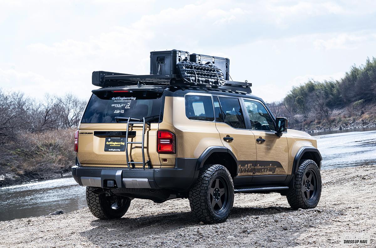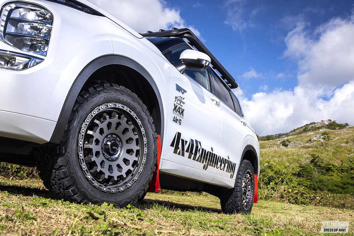 4×4エンジニアリングのランクル250はオーバーランド仕様がコンセプト。そもそも「オーバーランド」とは、オーストラリアなどの広大で自然に恵まれた国々で砂漠や森林、岩場などを走破し長距離移動を行うようなアウトドア志向のカーカルチャーを指す言葉。それが、ここ最近のSUVブームとともに、一気に盛り上がっているというわけ。そのため取り入れたのが、フロントランナーのルーフラックなどのトップ部分の架装なのだが、実は今回の目玉はそこではない。見るべきは足まわりだ。