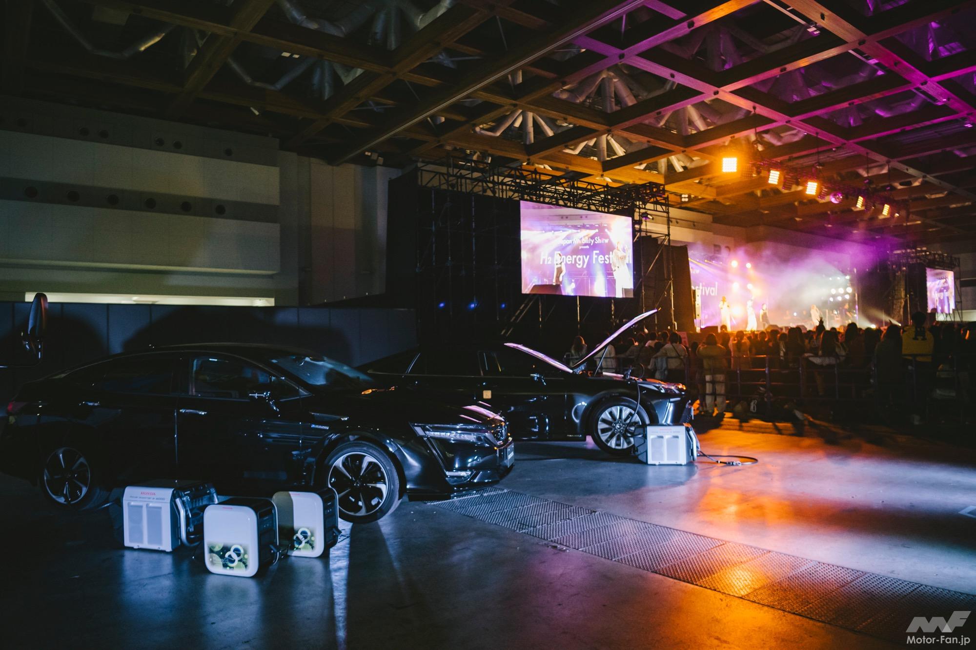 H2エナジーフェスティバルは、「 H2 Energy(水素エネルギー)」「High Energy(活気あふれる)」の2つの想いを込めて「H2 Energy Festival」(水素を活用した活気あふれるフェス)という名称に決定した。水素に関係する研究機関や複数企業と連携し、水素エネルギーを活用したステージを展開し、ステージの電源を水素由来のエネルギーでまかなっている。会場内に水素車両を設置、給電することで環境配慮型の新しいステージを実現するジャパンモビリティショーならではのステージだ。