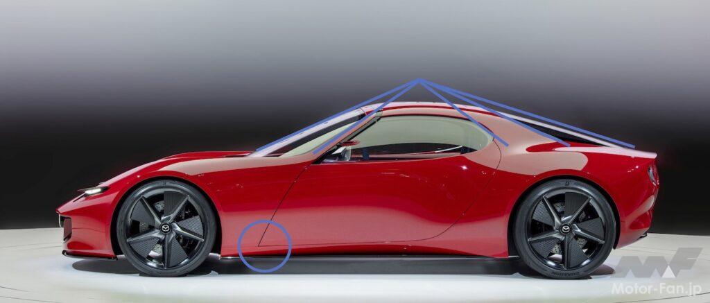 ただし推測ばかりでなく、少しわかったこともある。全長を4200mm以内とすること、びた一文も超えてはならぬ、とのお達しがあったのだというのだ。ロードスターは4000mm未満、RX-7は4200mmよりも少し長い。となるとこのモデルがRX-7に近い方向性を持つことには、間違いないようにも思える。しかしホイールベースは2590mmとRX-7よりも100mm以上長い。そして全高は1150mmというから、RX-7は言うに及ばすロードスターより低い。この寸法が見せるサイドビューのプロポーションは、極めて優雅だ。比較してみると全長が同等でもホイールベースの短いRX-7は、はるかに戦闘的に見える。