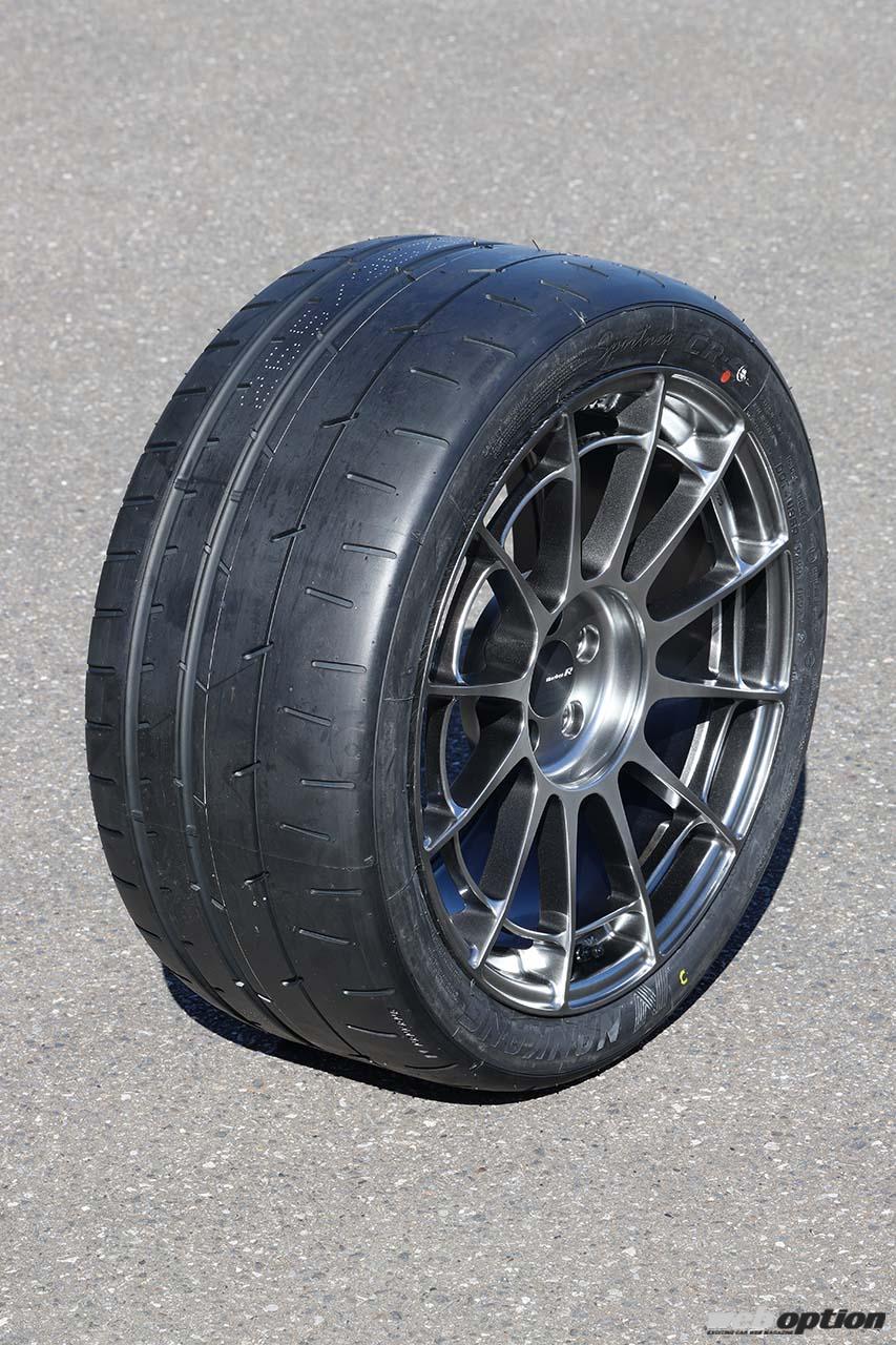 タイヤは全銘柄265/35−18で、ホイールはエンケイ『レーシングレボリューションNT03RR』のサイズ9.5Jプラス46×18インチで統一。空気圧は冷間時に1.6キロで、温間時で1.8キロになるよう調整した。