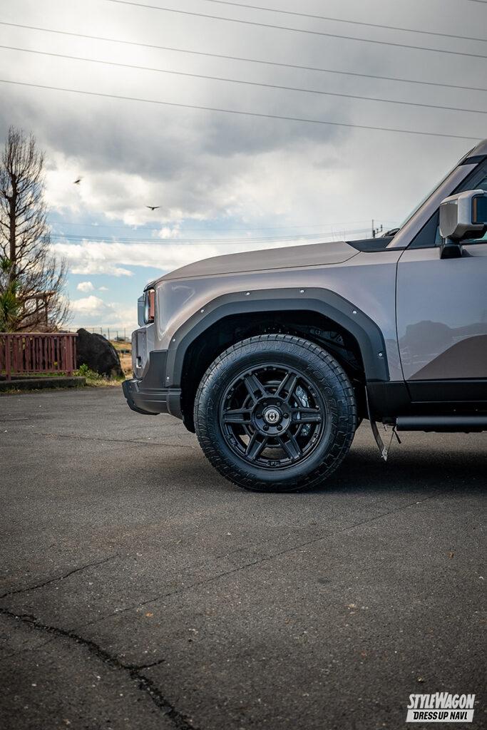 そこで世界中の名だたる高級ブランドのパーツを取り扱うラガーコーポレーションを含むボンドグループが新たに用意したのが、ランクル250/300にジャストフィットする専売サイズ。ご覧の通り、絶妙なツライチ具合で収まる。HREの本格オフロードホイールが、純正フェンダーのまま履けるのはうれしいニュースだ。