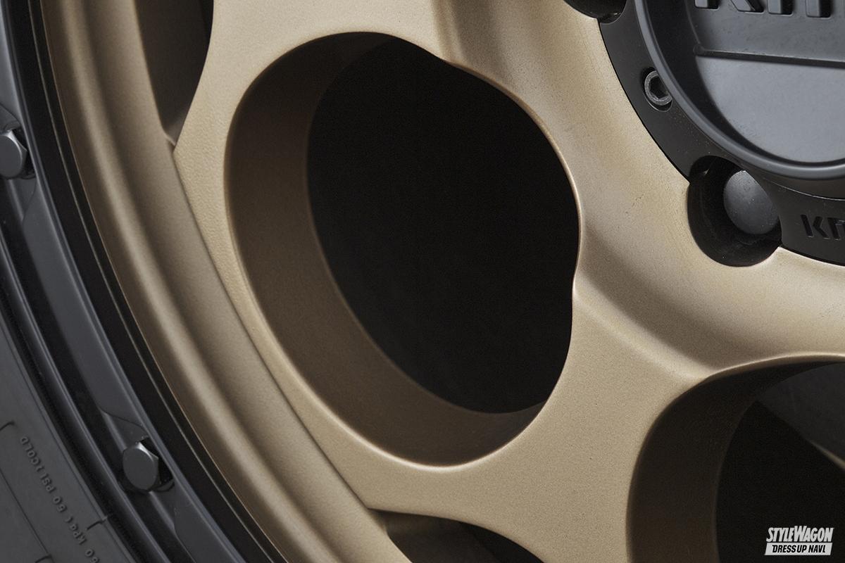 例えばこのKM541ダーティーハリー。コンケイブしたディッシュに丸窓を開けた、一見は王道の意匠に見える。が、そのディスクエンドには半円の窓が設けられていて、丸窓とY字スポークの融合体のようで斬新。存在感満点のビードロック風ボルトでオフ感も強烈。さながらリボルバーな意匠は個性絶大だ。