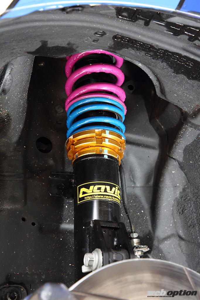 足回りはオリジナルの車高調(F12kg/mm R8kg/mm)を導入し、走行シーンに合わせてセッティングを変更。ヘルパースプリングを組み合わせることでコーナリング時の接地性を高め、タイヤをフルに使って曲がっていけるようにセットアップされている。