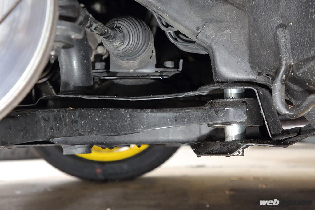 車高調の導入に合わせてロアアームブッシュもピロ化。路面からの入力の逃げを最小限に抑えて、よりダイレクトなハンドリングを実現するためのチューニングだ。なお、ナビックでは新品アームにピロを圧入したフロントピロロアアームも製品化している。