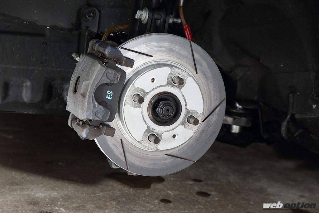 NAと言えどもブレーキチューンは必須。キャリパーはノーマルのまま、ディクセルのスリットローターにスポーツ走行向けパッドを組み合わせ、タッチの改善と安全性の向上を図っている。