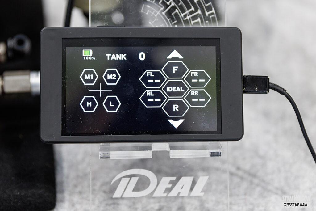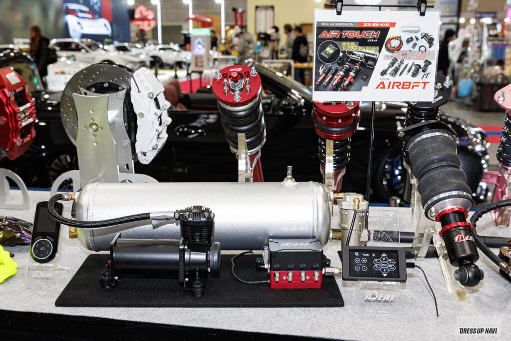 さて、もっとも注目すべきは精悍な低さを引き出した、メモリー機能搭載タッチパネルリモコン付属のエアサスシステム「エアタッチ」。省スペースで高機能・ハイレスポンスな電磁弁ユニットのほか、上質な乗り心地と安定した走りを生む36段階調整式ダンパーやシステムを安定稼働させるウォーターセパレーターと、充実したシステム内容でLMにふさわしいフットワークを構築している。