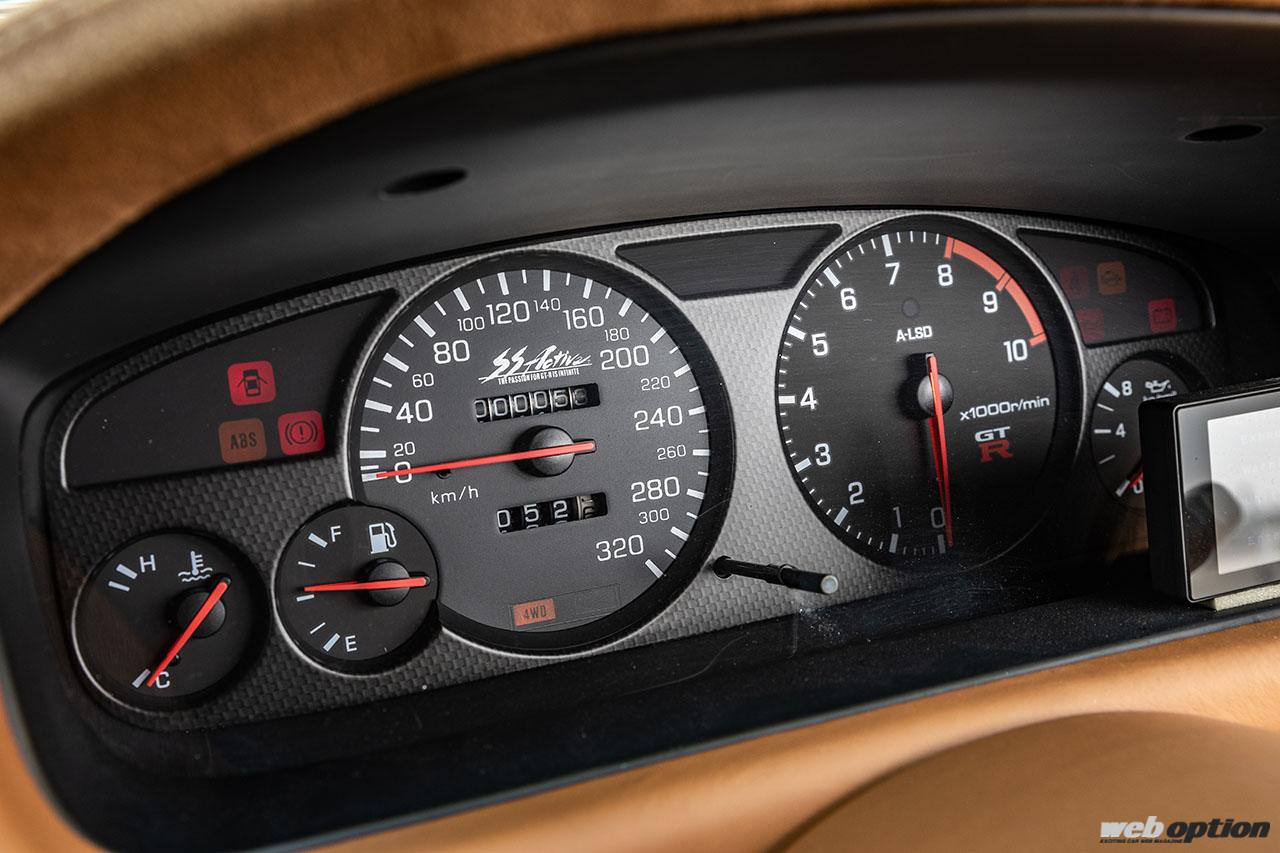 320km/hスケールのスピードメーターもアクティブ製。その指針は320km/hまで刻まれている。ブラックのバックスキンで仕上げられたステアリングはアクティブとレナウンのコラボアイテムだ。
