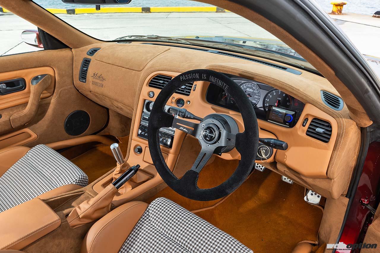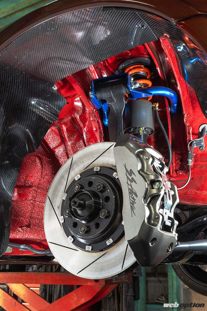 足回りはHKSハイパーマックスSにオリジナルのエアリフターを組み合わせたスペシャル仕様だ。アーム類はブッシュをリフレッシュしつつ調整式を導入してワイドボディに適したジオメトリーを実現。一方のブレーキは、アクティブのオリジナル製品の中で頂点に君臨するモノブロックシステム(F:6ポット R:4ポット)を奢る。