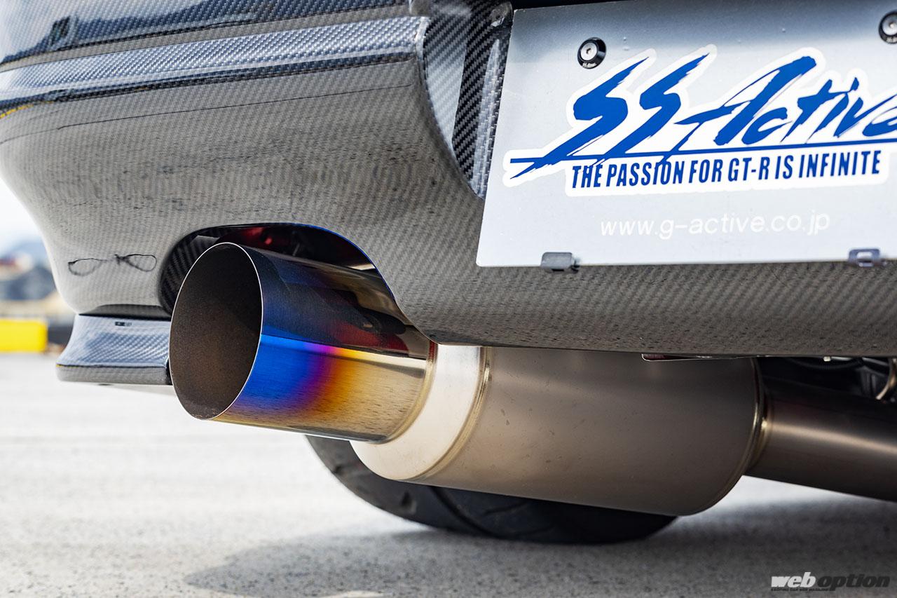 EXマニは既製品ではなくアクティブによるワンオフメイドで、その美しさはエンジンルームのアイキャッチとしての役割も果たす。ヒートグラデーションが美しいエキゾーストマフラーは、フルチタン製のガレージアクティブオリジナルだ。