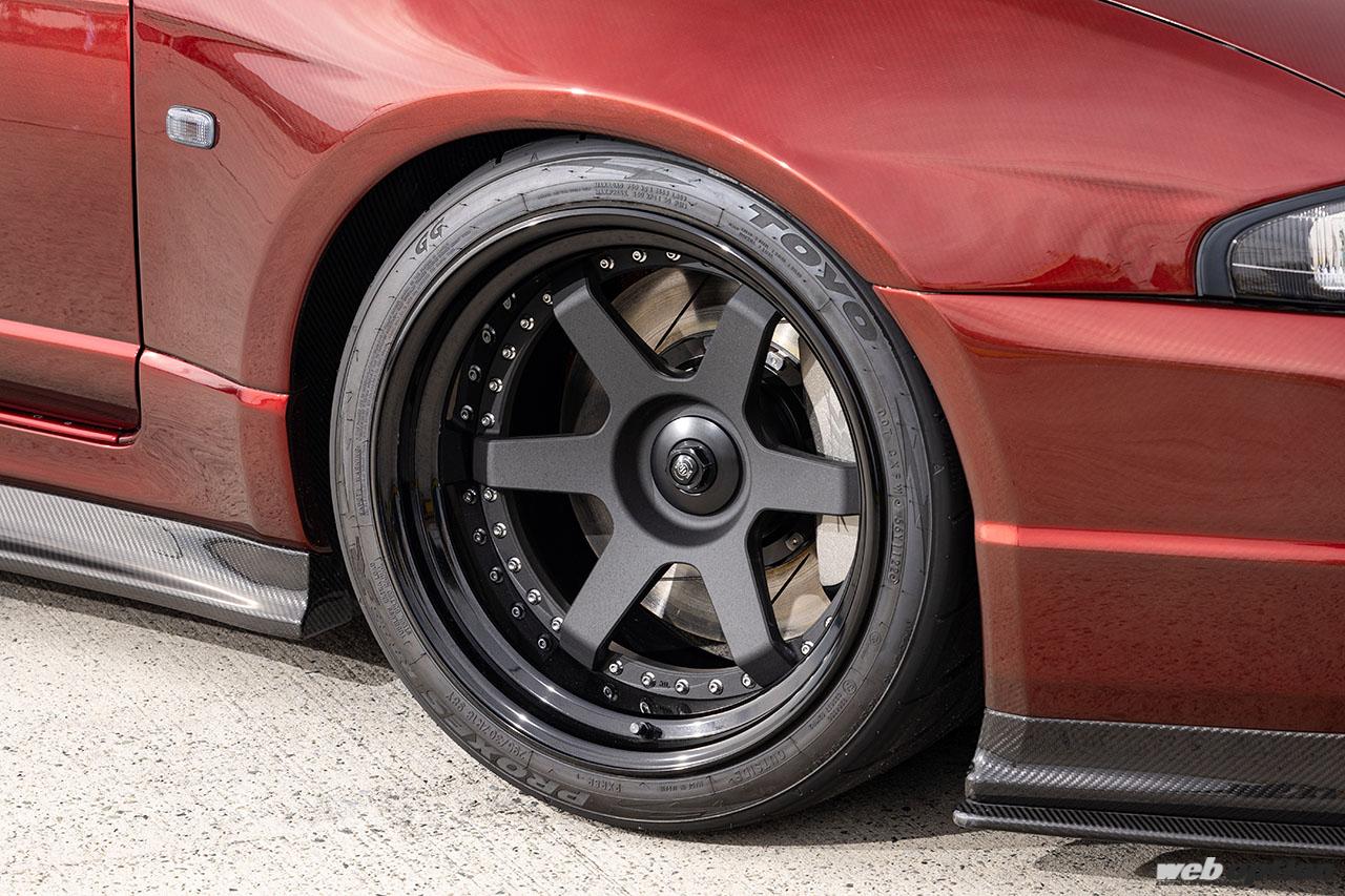 ホイールもオリジナルのRC-VI(12J×18インチ)。ワイドトレッドスペーサーのような専用の変換プレートを介して、114.3−5Hからセンターロック仕様へとコンバートしている点も見逃せない。