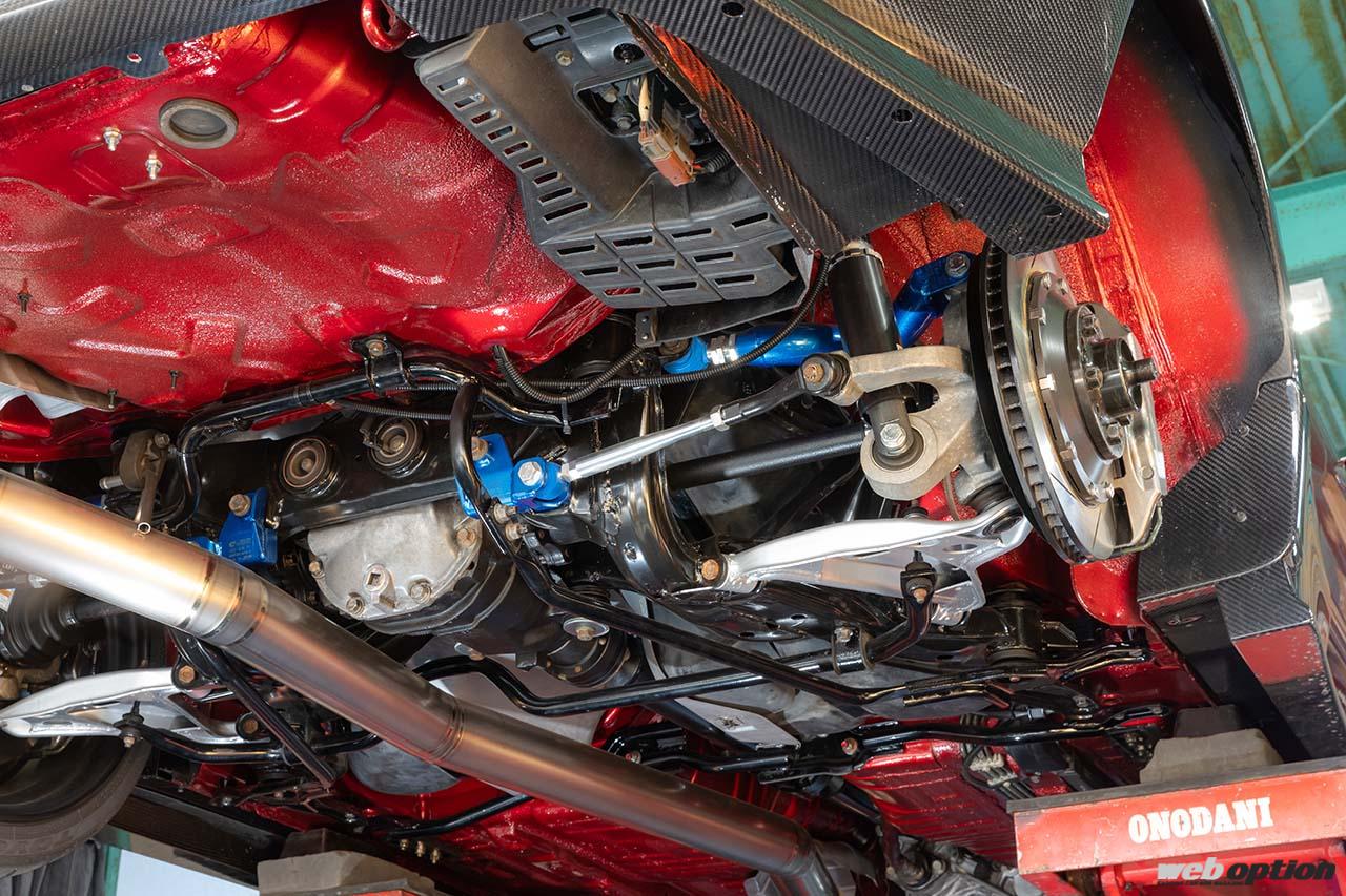足回りはHKSハイパーマックスSにオリジナルのエアリフターを組み合わせたスペシャル仕様だ。アーム類はブッシュをリフレッシュしつつ調整式を導入してワイドボディに適したジオメトリーを実現。一方のブレーキは、アクティブのオリジナル製品の中で頂点に君臨するモノブロックシステム(F:6ポット R:4ポット)を奢る。