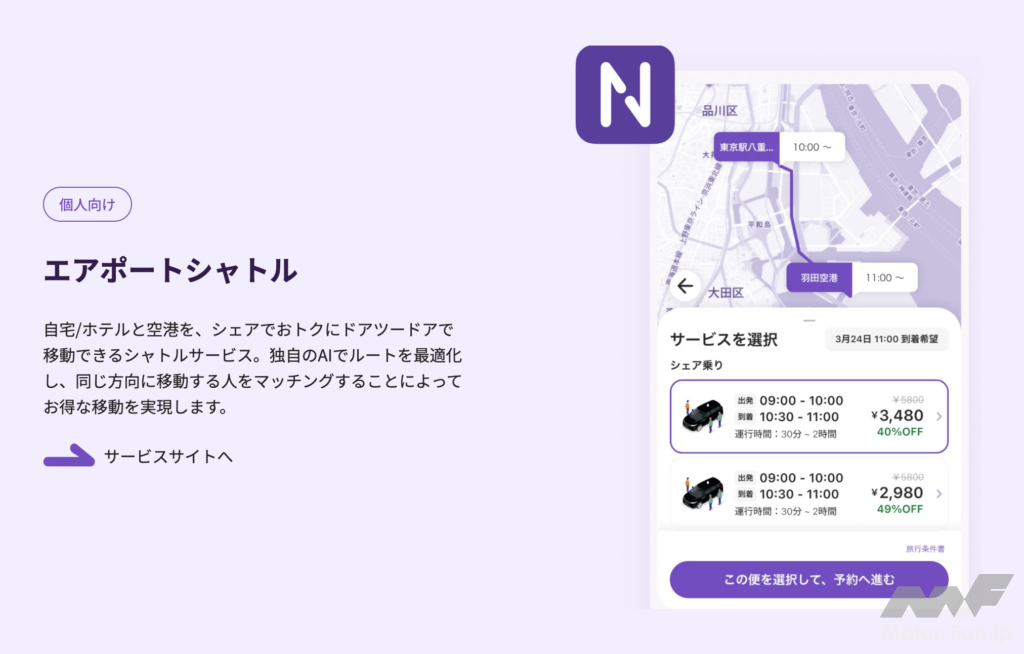事前の予約でタクシー利用者をAIがマッチングし、利用者同士がタクシーをシェア(相乗り)するマッチングサービスだ。現在は全国13の空港でサービスを展開していて、今後も利用範囲は拡大する予定だ。