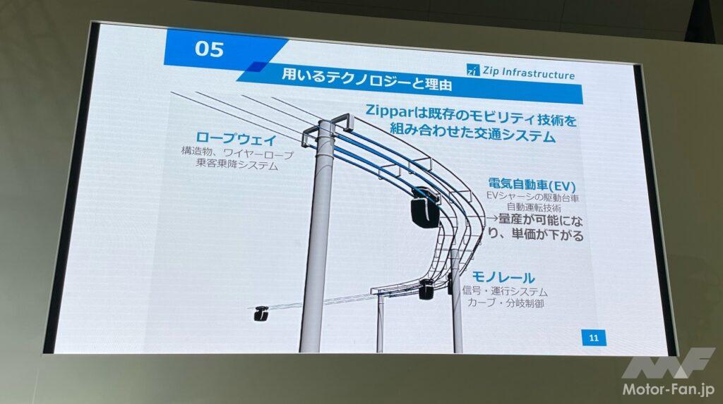 ロープとゴンドラが独立しているため、これまで難しかったカーブを可能にして柔軟な路線設計ができる。また、既存のモノレールに比べ、約1/5 のコスト(15億円/km) ・期間(1年)で建設可能となって点が特徴だ。