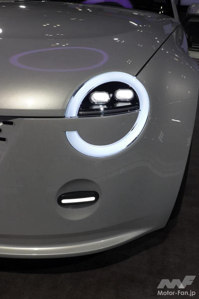 ただし、ディティールを検分していくと初代のデザイン手法とは明らかに違う箇所があることにも気づく。初代コペンはフロントグリルに合わせたボンネットの開口部でフロントフェンダーを区切り、そのまま車体側面の面へと流れるスタイリングが特徴であったのに対し、ビジョンコペンは初代をモチーフにしつつも、ボンネットとグリルのラインに連続性はなく、キャラクターラインを廃したことで一層の塊感を演出している。初代とショーモデルを比較すると受ける印象はたしかに似てはいるのだが、けっして単なる焼き直しではない。