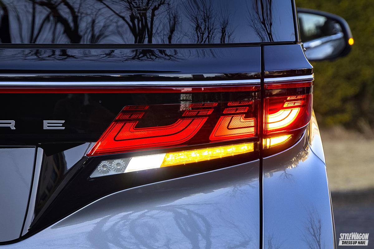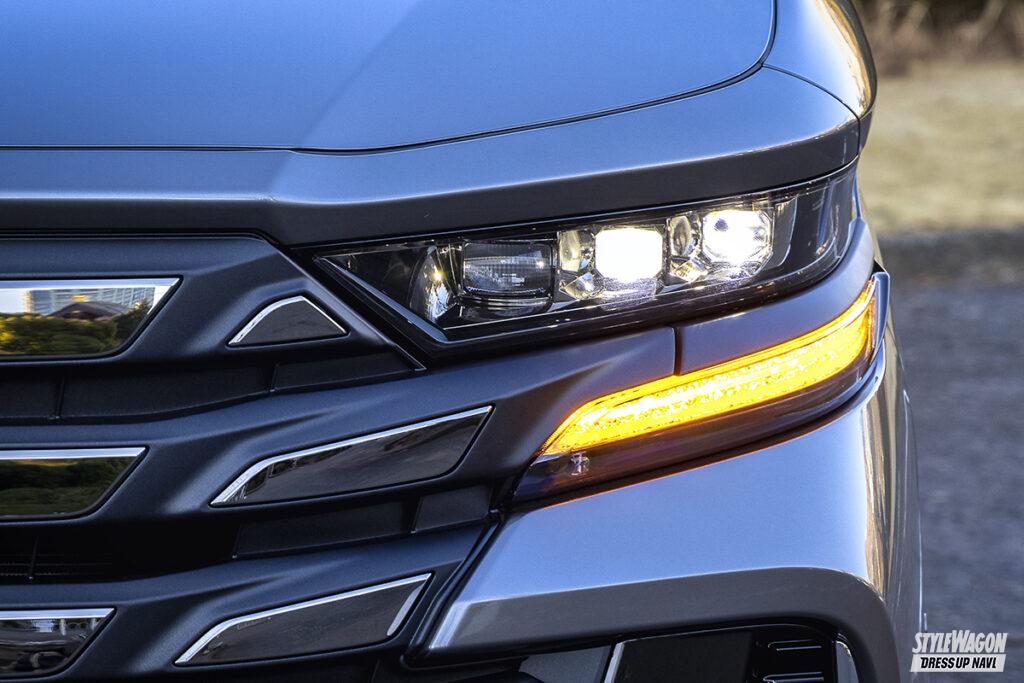灯火類の配置はPHEVも特に変更なし。外側2灯がロービーム、内側が1灯がハイビームとなる3眼LEDヘッドランプと、デイタイムランプを兼ねたLEDクリアランスランプが備わる。