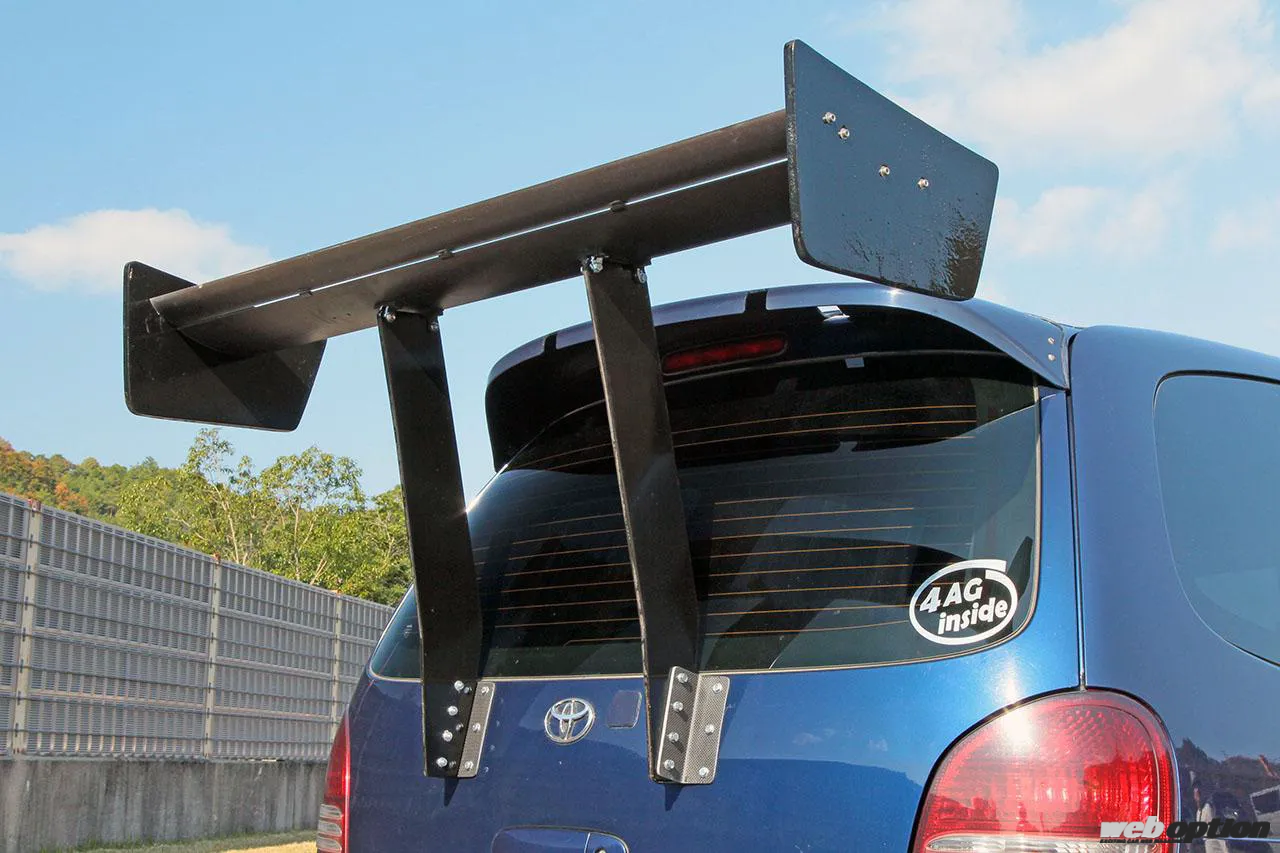 リヤウイングは既製品のGTウイングをベースにワンオフでステーを製作。リヤハッチから立ち上げるバーチカル形状とし、強烈なダウンフォースを発生させる。