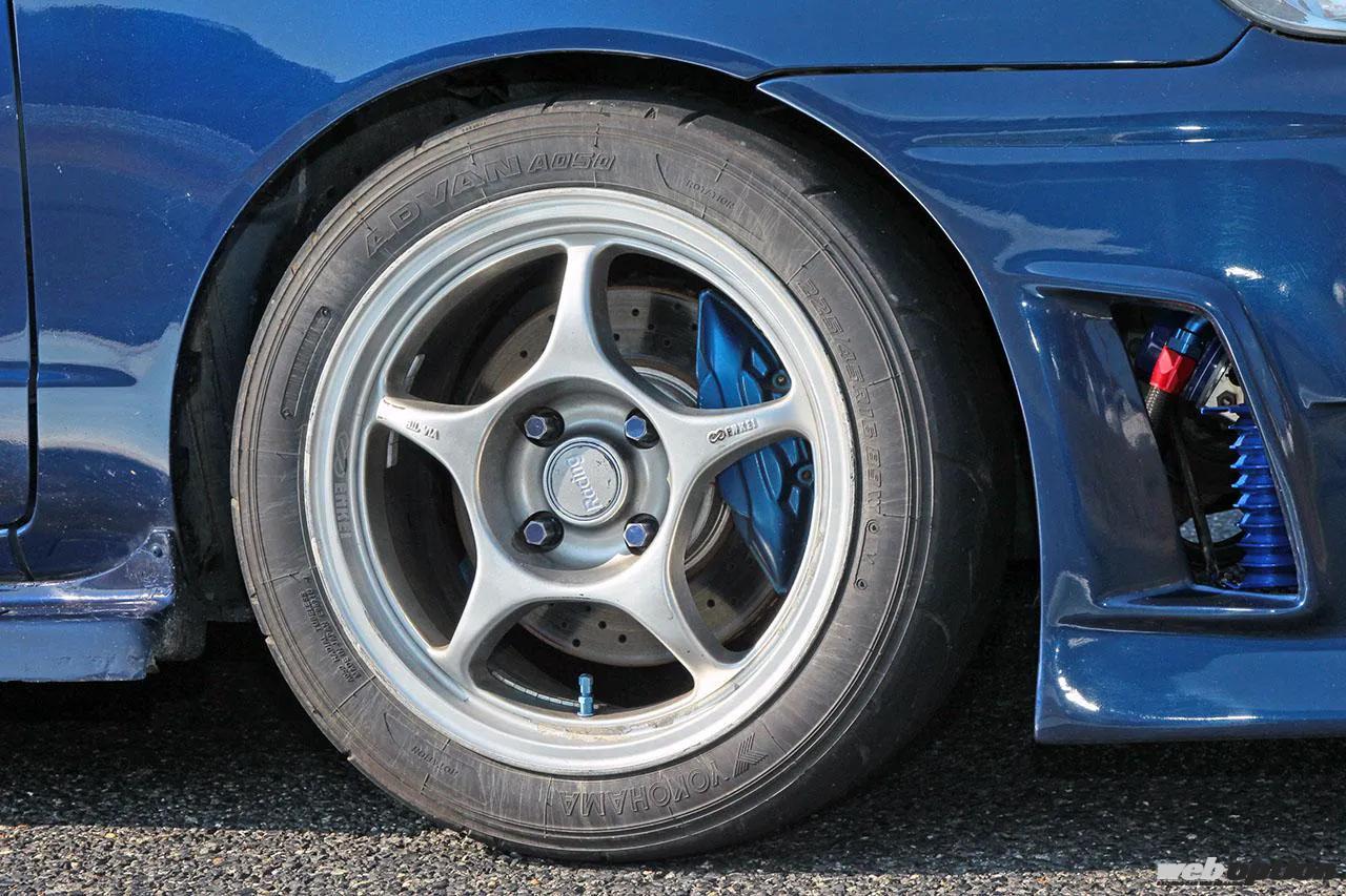 ホイールは16インチのエンケイRP01。サイズはフロントが8.0J+38、リヤが7.0J+35。組み合わされるタイヤはアドバンA050だ。