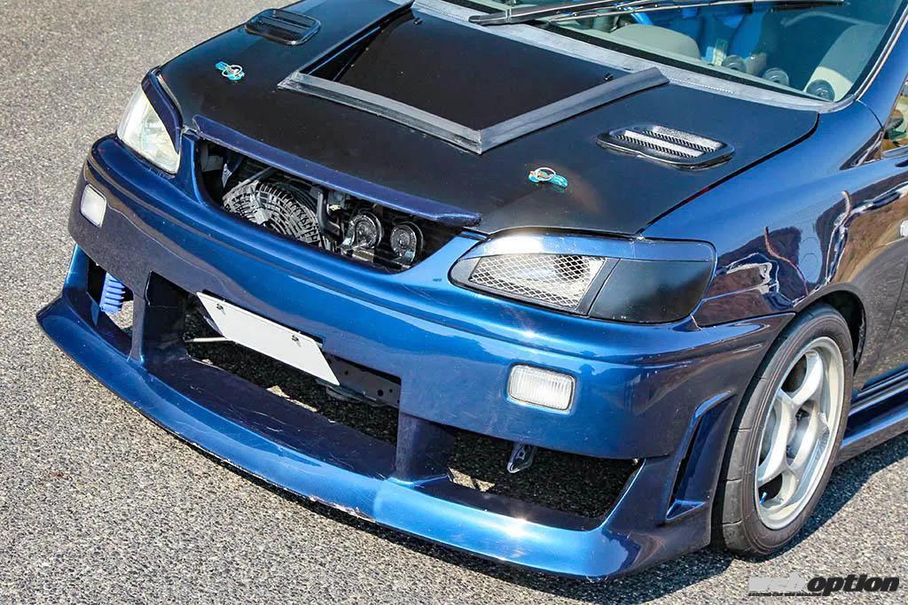 エクステリアもオーナーのDIY精神が炸裂。フロントバンパーはカローラスパシオ後期をベースに、S14シルビア後期の社外バンパーをドッキング。ボンネットも純正加工でダクトを追加している。