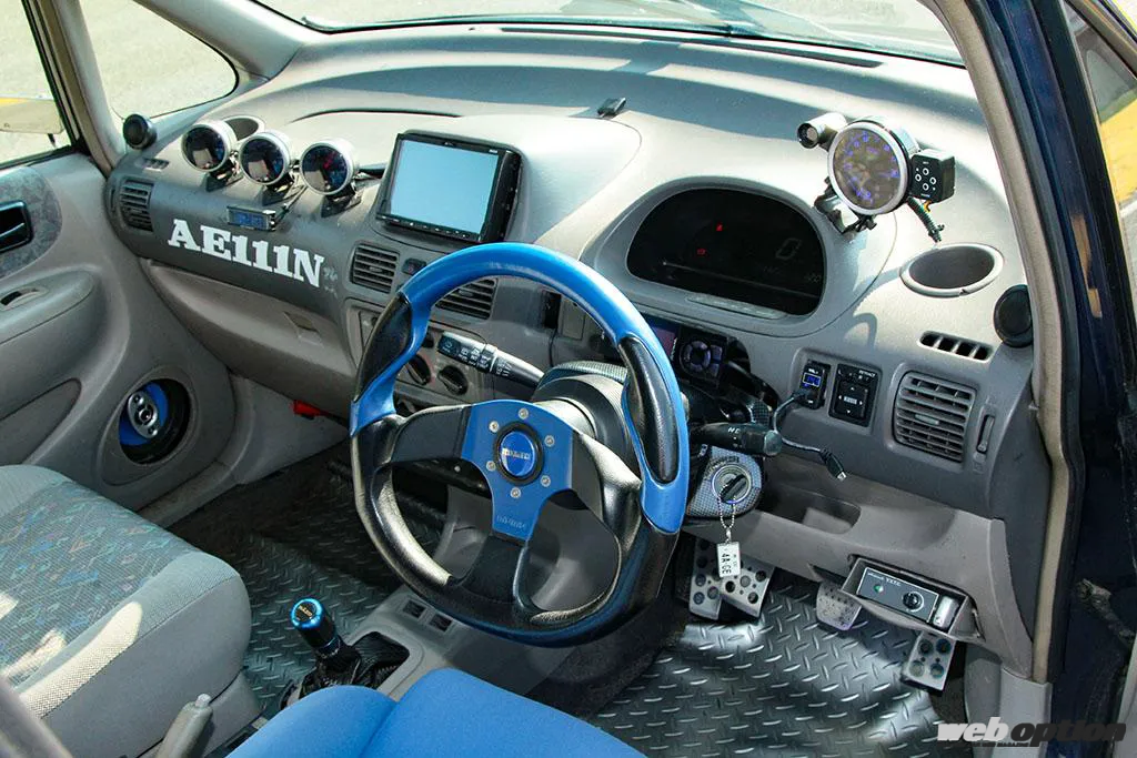 そこでオーナーは、“闘うミニバン”を目指してチューニングを開始。まずエンジンは、同型の4A-GEへのスワップを自らの手で敢行。エンジン本体も、戸田レーシングの82φハイコンプピストンや東名パワードのポンカムを組み込み、本格的なメカチューンスペックを作り上げている。