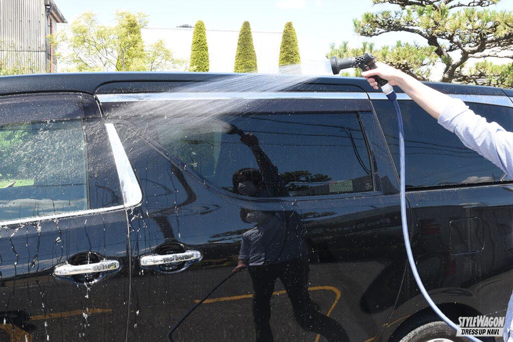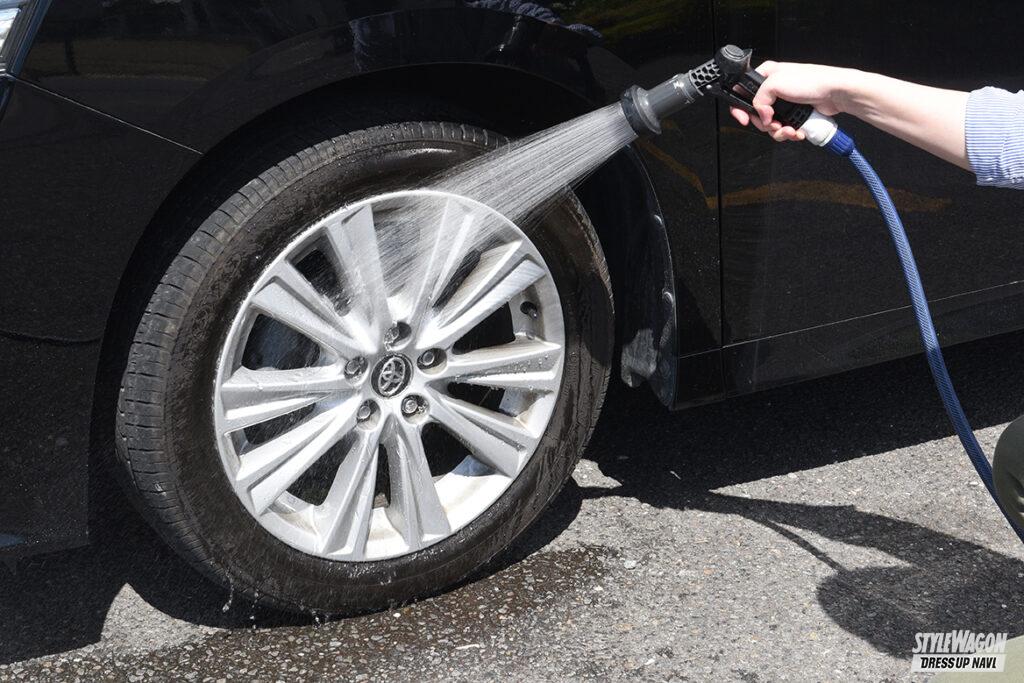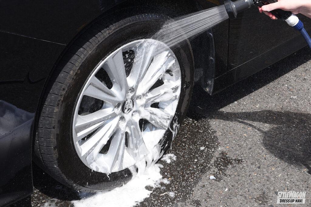 洗う、といってもただ闇雲に洗えばいいというわけではない。水が上から流れるように、汚れも上から落ちていくので、順番をしっかり守らないと洗ったつもりでも、汚してしまうこともある。。まず大まかな順番だが、ホイールから洗いその後はボディ。これはホイール(足回り)は地面に近い=泥汚れが一番ついている、という理由からで、前述の通り汚れを散らさないためだ。そして意識したいのがパネルごとに洗うということ。これは洗浄に使うシャンプーがボディ表面で乾かないようにするためで、乾いてしまうとボディへシミがついて取れなくなることがある。これを防ぐために乾かないよう短時間で行うのが鉄則。これらの作業はしっかりと考えて行えば、洗う作業も難しくないはずだ。