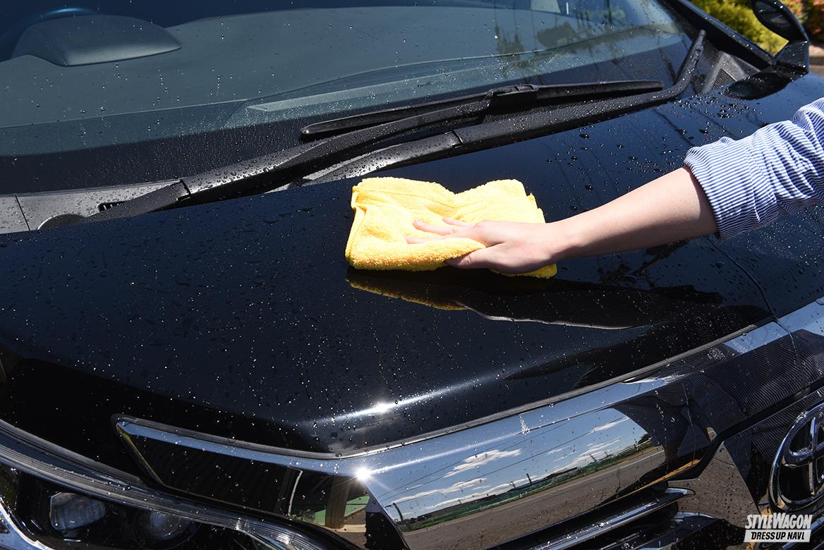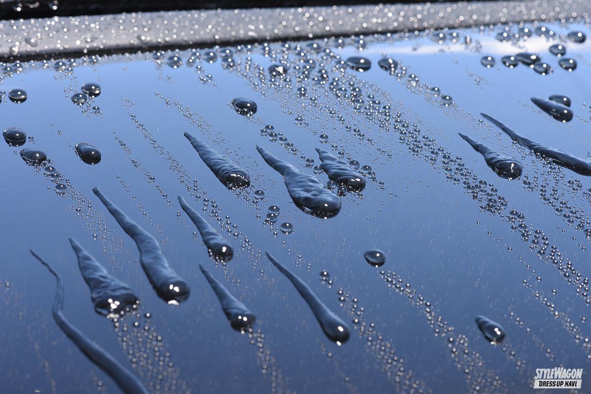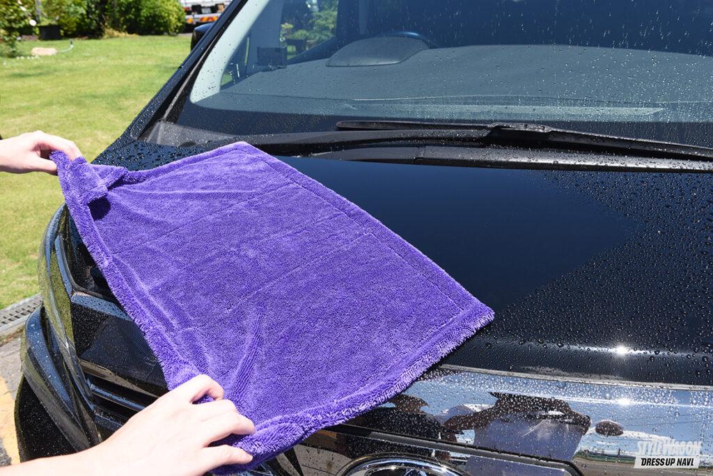 拭き上げ作業は、実のところ洗う作業よりもシビアなものかもしれない。ボディについた水滴は早めに拭かないと、水分中に含まれているカルキ成分が、ボディに白く残ってしまうからだ。これを防ぐために、水滴が乾かない内に作業を進める大きなポイントは二つ。曇りの日に洗車(直射日光は水滴を通してボディの塗装面が焼き付いてしまう)し、よく水を吸うクロスを使うこと。これだけを押さえるだけで作業がもっと楽ちんになるはずだ。そして最近では、よく水を吸って、拭き筋残りがないクロスが多数ラインアップされている。ボディが大きい=拭くのがめんどくさいミニバンなどにはマストなアイテムなので、チェックして欲しい優秀なアイテムだ。