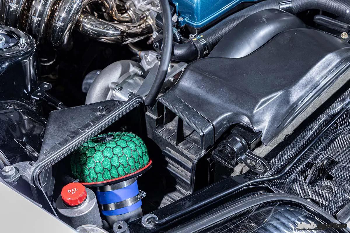 超ロングEXマニを目立たせるために、その他の部分はブラックアウト&カバーリング。HKSのパワーフローも純正のエアクリーナーボックス内に隠すようレイアウトしている。