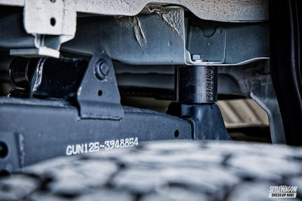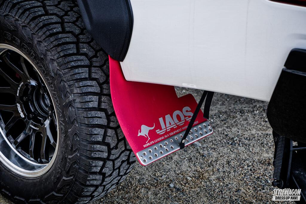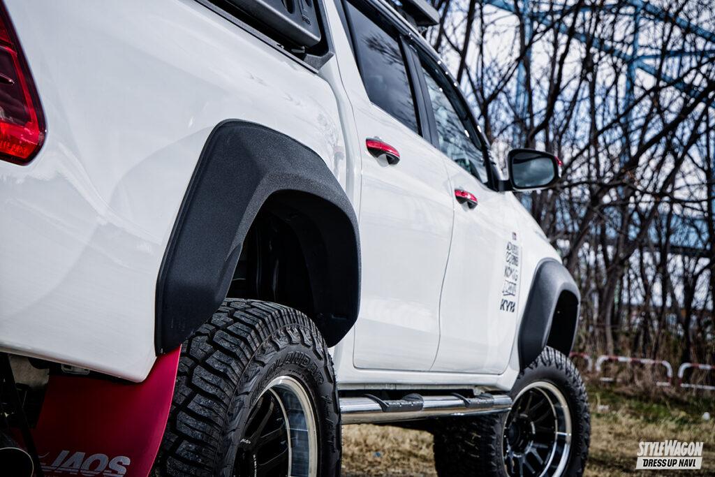 一撃で伝わるカスタム感こそ、最大のウリ。デカくイカつい魅せ技が数々投入される。まず、足まわり。ジャオスのリフトアップキットと、ガレージミニッツのボディリフトキットのコンボで4インチのリフトアップを達成。さらに、マイナスインセットの鍛造ホイール07Xと、極太33×12・50のオフタイヤをセット。ワイド感極まるタイトヨタのGR純正フェンダーにネジ込んで、パンチの効いた今旬の4×4フォルムを打ち出した。