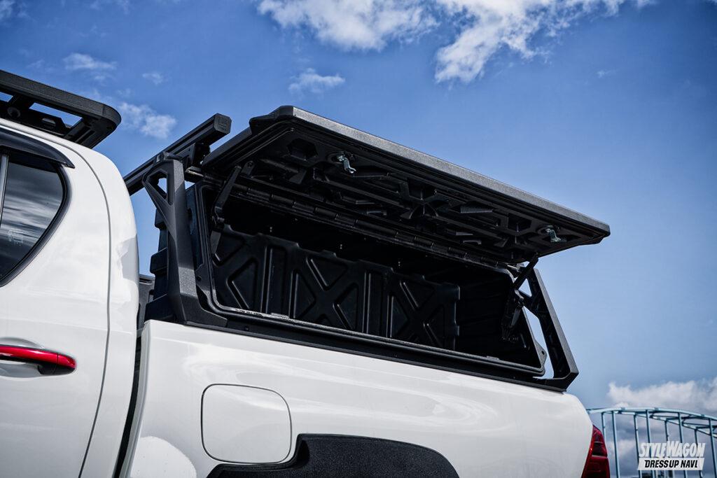 ピックアップトラックの積載性能を、いっそう拡張するアイテムも投入。レイトナーデザインのカーゴシステムを組み、ギアポッド×2をセット。さらに、荷台には、長物も収納可能なデックドのドロワーシステムを搭載。仕事道具はもちろん、趣味の釣りやキャンプの時にも威力を発揮しているという。