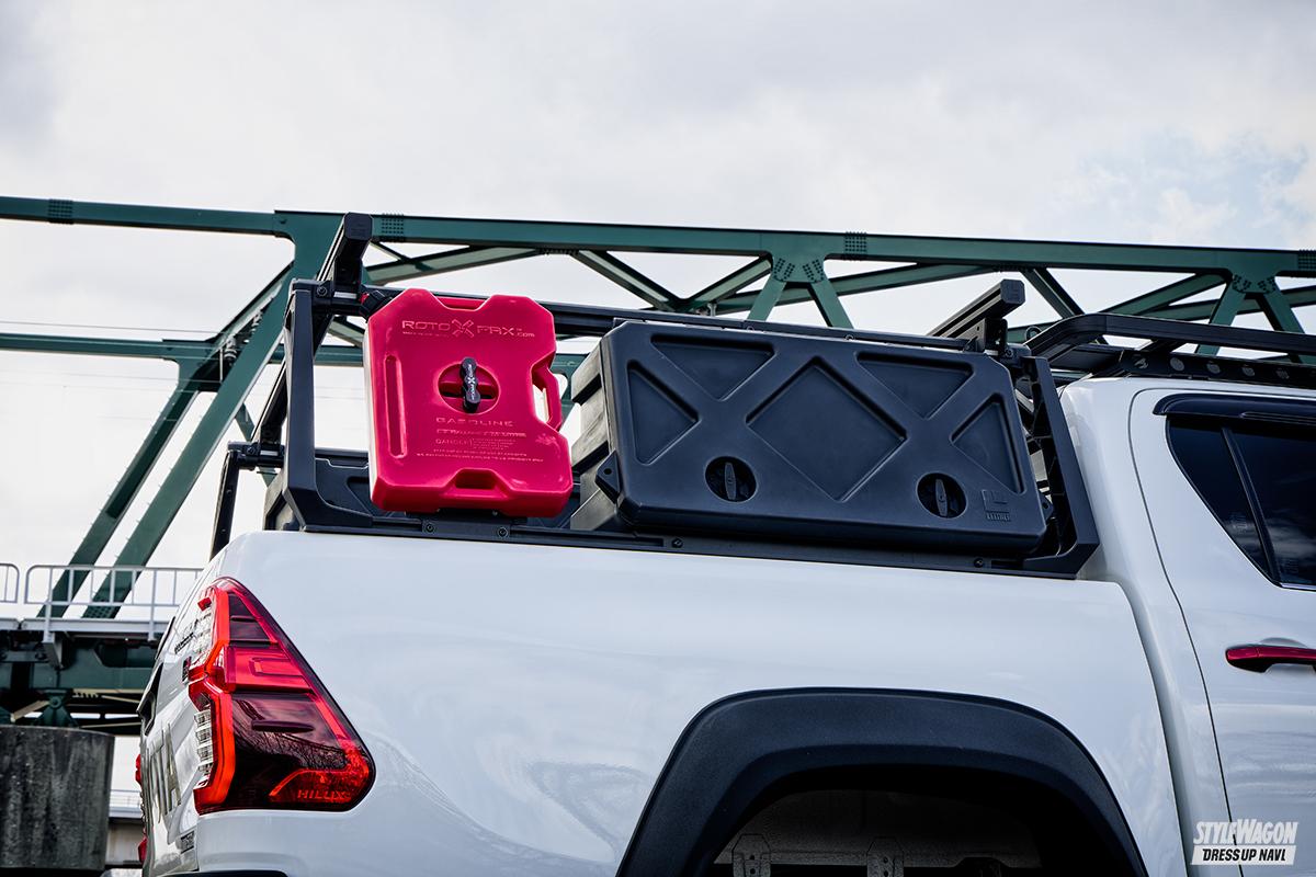 ピックアップトラックの積載性能を、いっそう拡張するアイテムも投入。レイトナーデザインのカーゴシステムを組み、ギアポッド×2をセット。さらに、荷台には、長物も収納可能なデックドのドロワーシステムを搭載。仕事道具はもちろん、趣味の釣りやキャンプの時にも威力を発揮しているという。