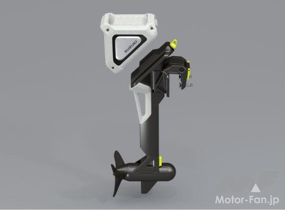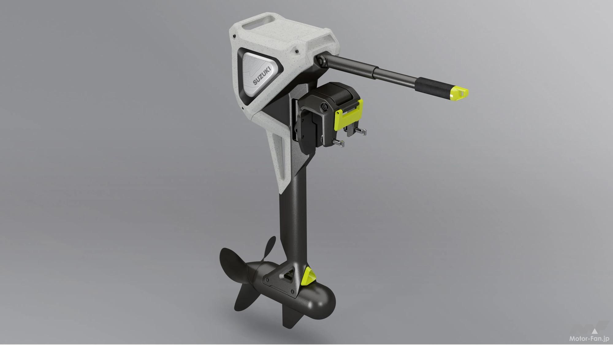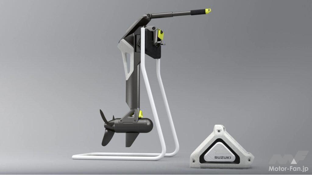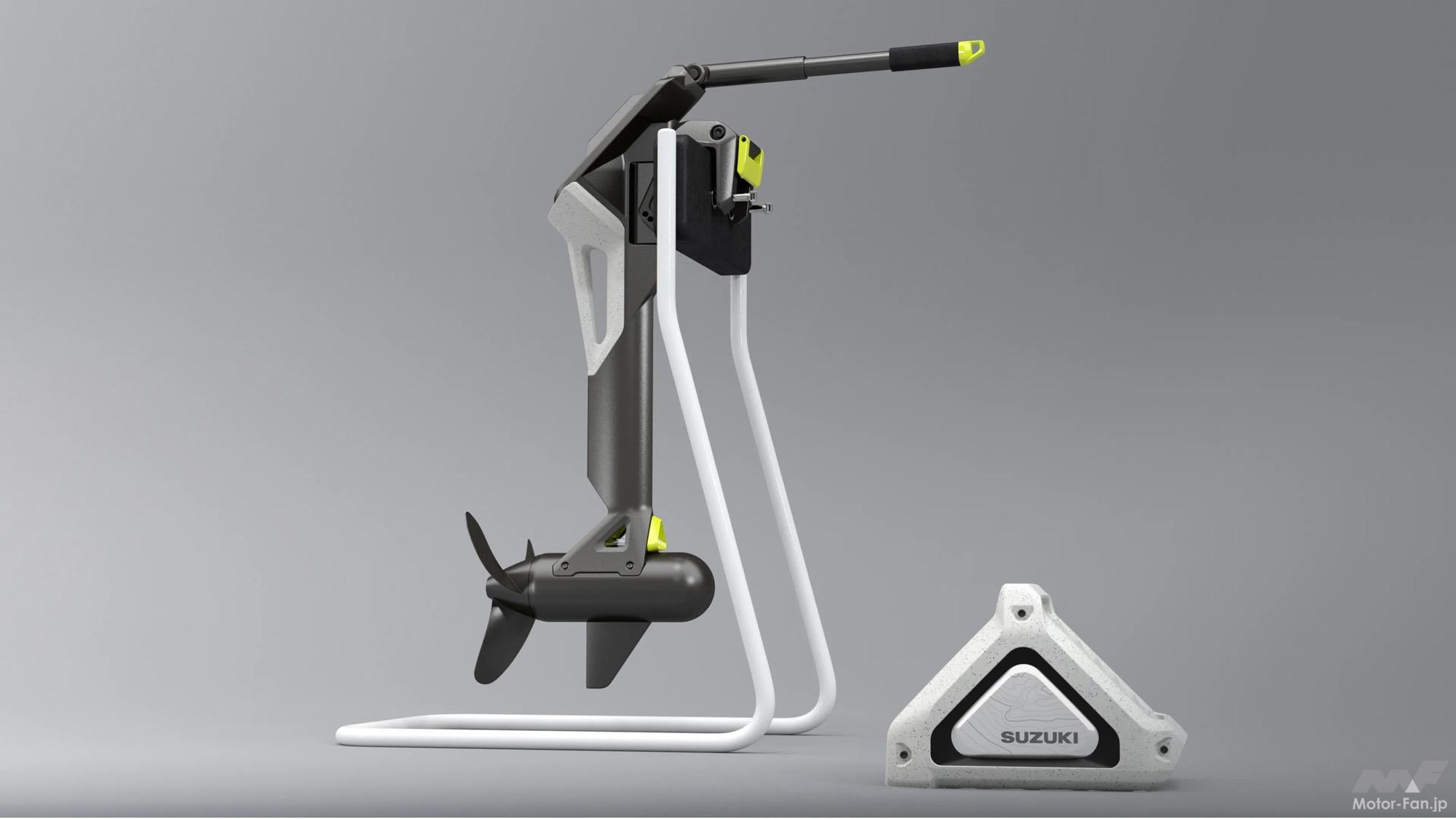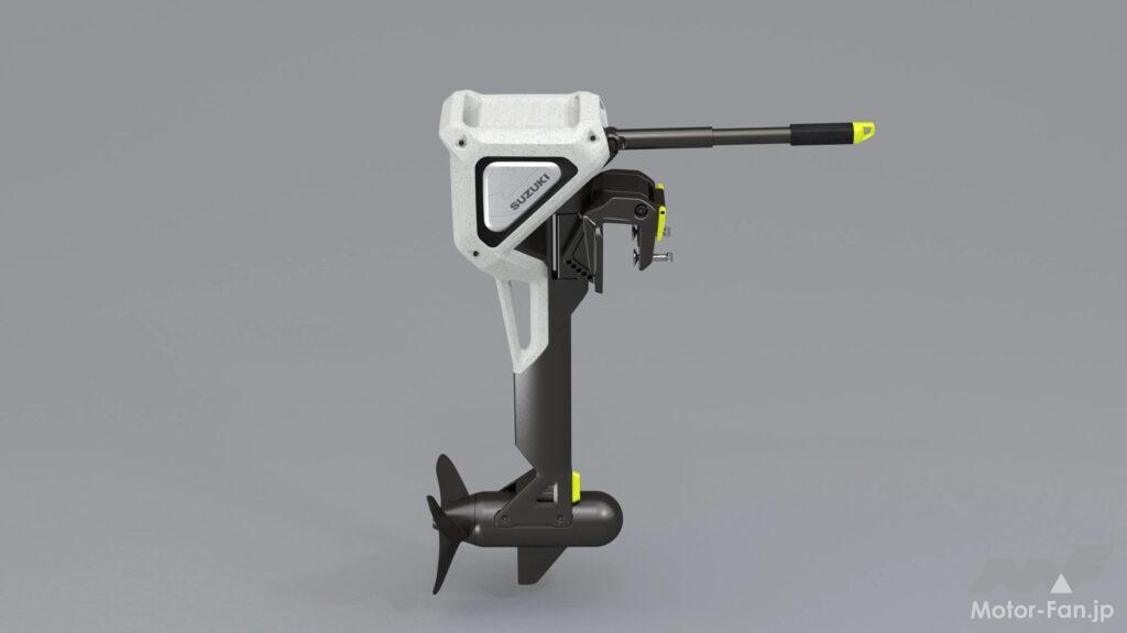 こういったそれぞれの特性から、電動船外機は湖で使う人が多く、やはり主流はエンジン船外機というのが現状だ。そんな中、ジャパンモビリティショー2023のスズキブースの一角に「Small e-outboad concept」なる電動船外機が展示された。