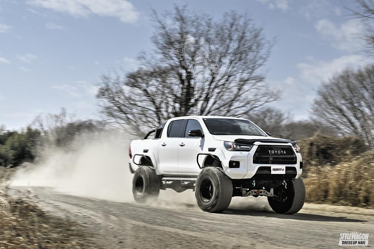 ツーリング用とサーキット用をそれぞれ持つなど、趣味でバイクを楽しんでいたtsumijiさん。トランポ用のクルマが欲しくなり、ハイエースやグランエースなどが候補に上がったものの、最終的にルックスでハイラックスに白羽の矢が立った。ただ、運命のイタズラなのか、購入後トランポにすることはせずカスタマイズの世界に足を踏み入れていくことに。