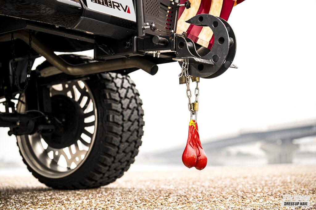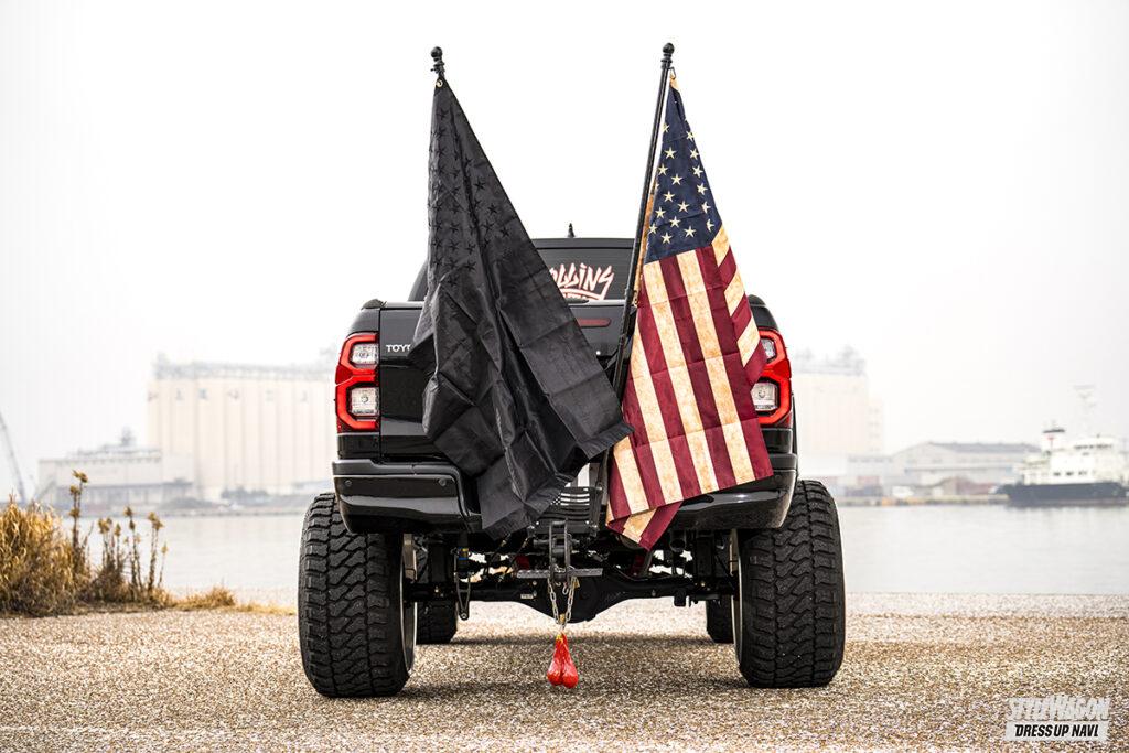 そうしてできたのが、クモの巣モチーフのディスクがセットされた、16J、インセットがマイナス102というド迫力のハイフォージド製オーダーメイドホイール。要の方向性が変わったため全体のコンセプトも見直し、車高をあまり上げすぎない「ローワイドスタイル」へと進めることにした。ただ、そんな中でも当初からのUS志向は変わらず、2種類の国旗やトラックナッツでアピール。