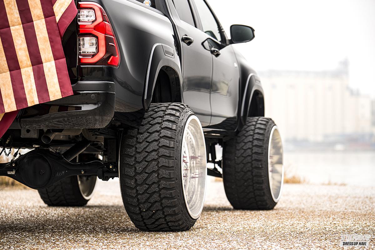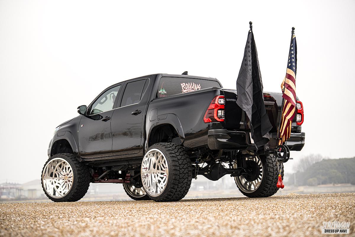 そうしてできたのが、クモの巣モチーフのディスクがセットされた、16J、インセットがマイナス102というド迫力のハイフォージド製オーダーメイドホイール。要の方向性が変わったため全体のコンセプトも見直し、車高をあまり上げすぎない「ローワイドスタイル」へと進めることにした。ただ、そんな中でも当初からのUS志向は変わらず、2種類の国旗やトラックナッツでアピール。