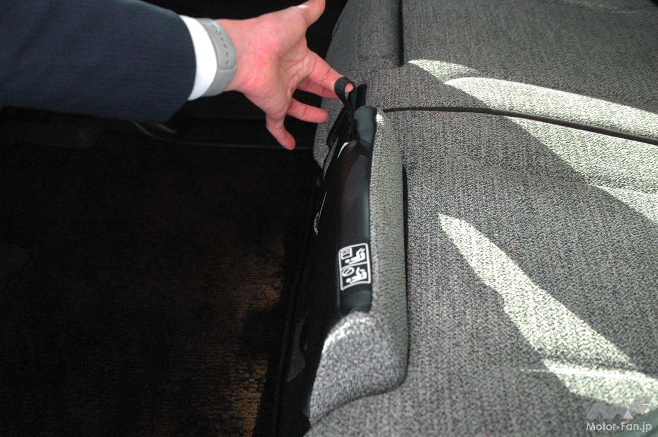 加えて、フラップを垂直にすることで、リヤシートに置いた荷物を前方に滑り落ちないようにするストッパー的な使い方も考慮されている。これは、キャンプ道具などをコンテナに入れて積載する際の使い勝手を考慮したものだと言う。