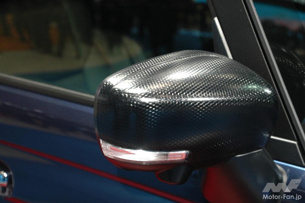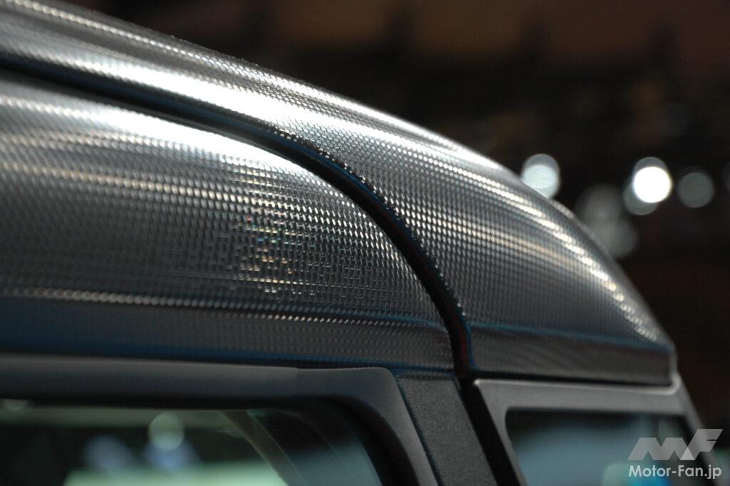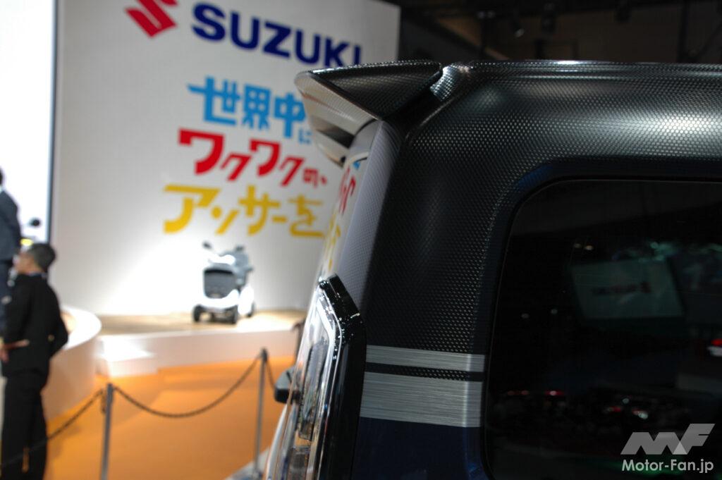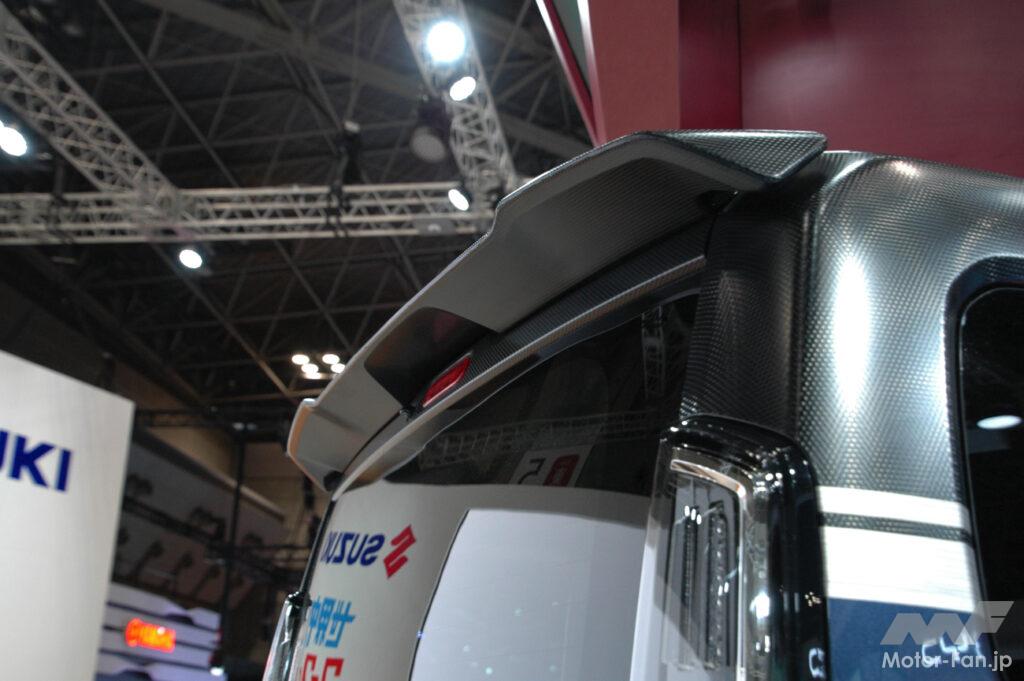 スペーシアカスタムコンセプトでは、リヤスポイラーやミラー、ルーフラインなどにカーボン調の加飾を施し、よりスポーティさを強調したスタイルになっている。