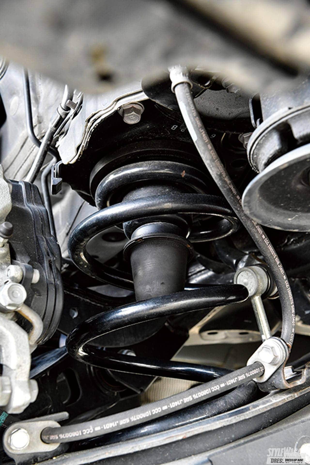 ストラット構造のフロントはリアと異なり、スプリングとダンパーがセットされた状態。