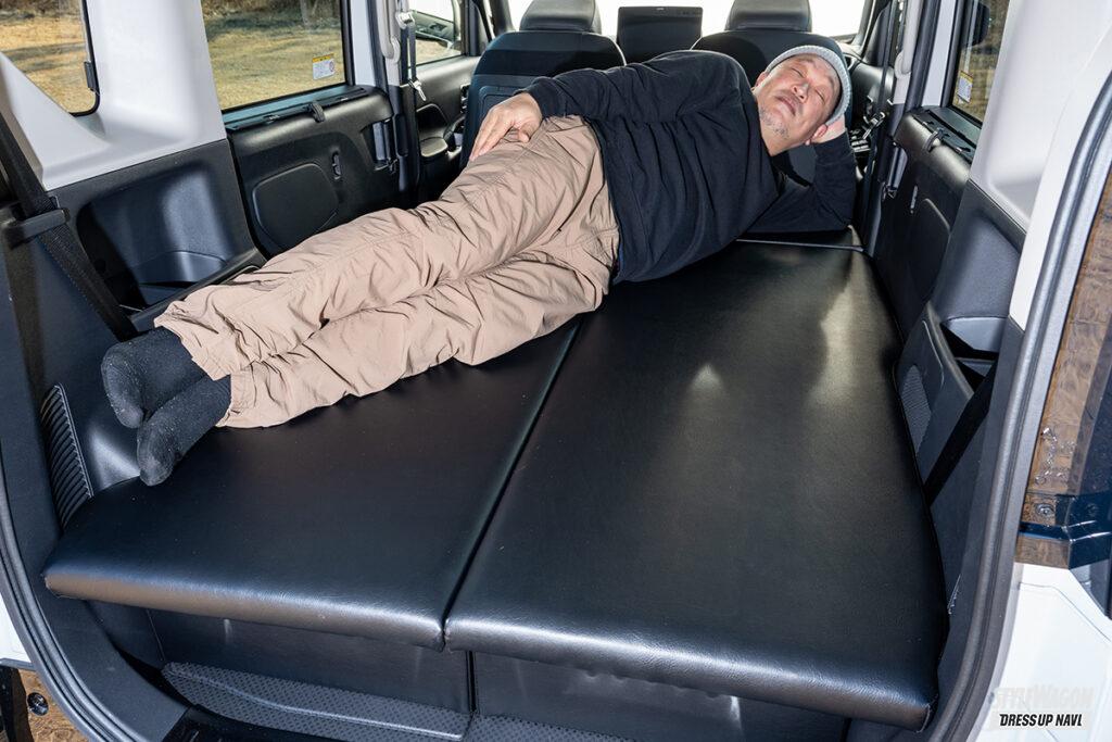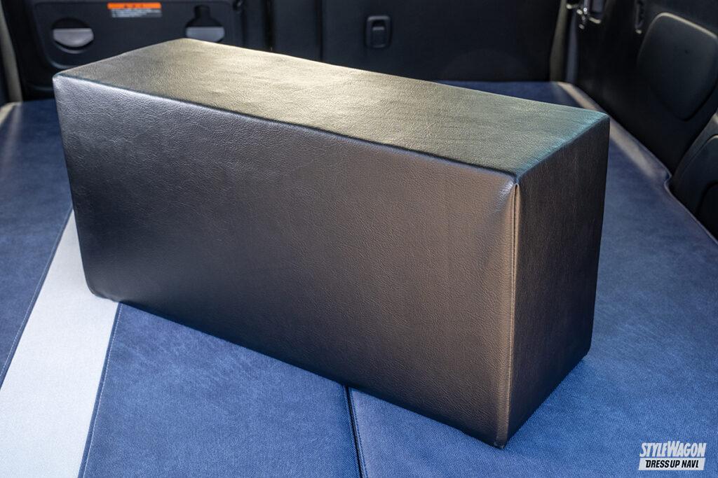 後席を倒した上に設置するデリカミニ専用のベッドキット。工具不要で組み立てることができるのでDIYなどに不安がある人でも楽々取り付けられる。オプションとなる専用クッションを組み合わせることで、約1600mmの奥行きを確保することができる。約30mmのクッションを内蔵しているので寝心地も抜群で、大人3人が乗ってもたわまない耐久性を確保している。