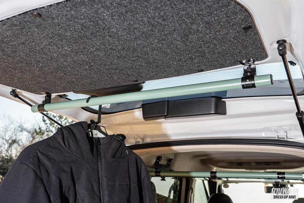 アッパートレーとぜひ一緒に追加したいのがバックドアパイプ。リアゲート室内側へクロスパイプを設置することで、リアゲートを開けたときにウェアやバック、ランタンなどのアウトドアギアを手軽に吊るすことができる。アッパートレーと同じ全3色をラインアップしているので、ぜひ同じ色でコーディネイトしたい。